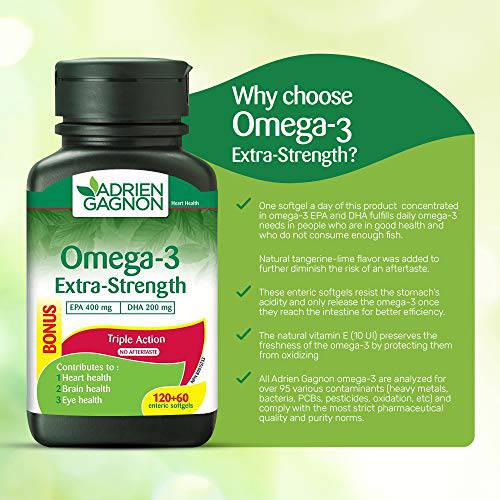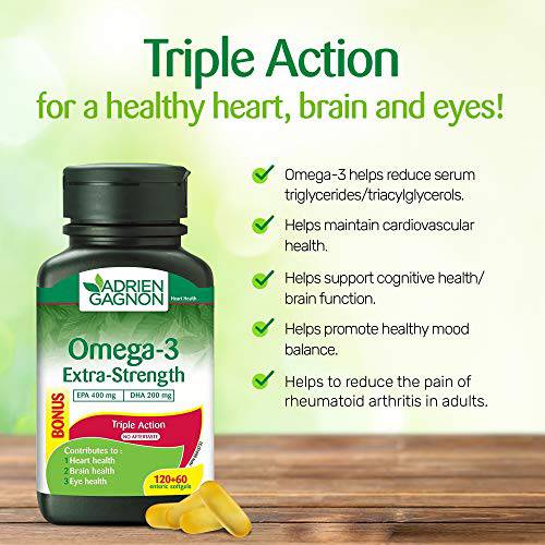 Adrien Gagnon - Omega 3 Extra-Strength (400 mg EPA + 200 mg DHA), 1000 mg, Cognitive, Cardiovascular and Joint Support. 180 (120+60 Bonus) Softgels
