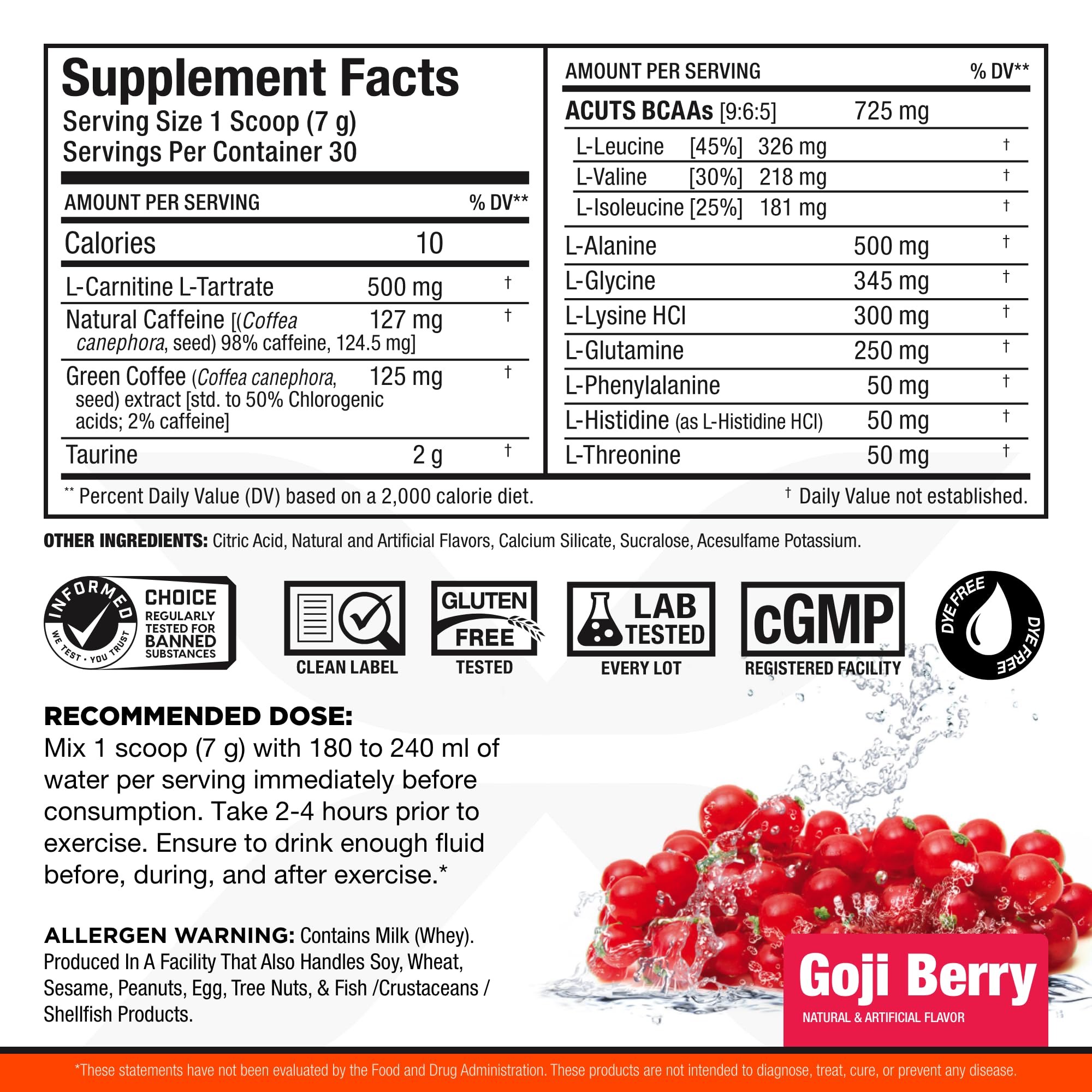 ALLMAX Nutrition - AMINOCUTS (A:CUTS) - Weight-Management BCAA (L-Carnitine + Taurine + EAAs) - Goji Berry - dye free - 252 Gram - 36 Servings