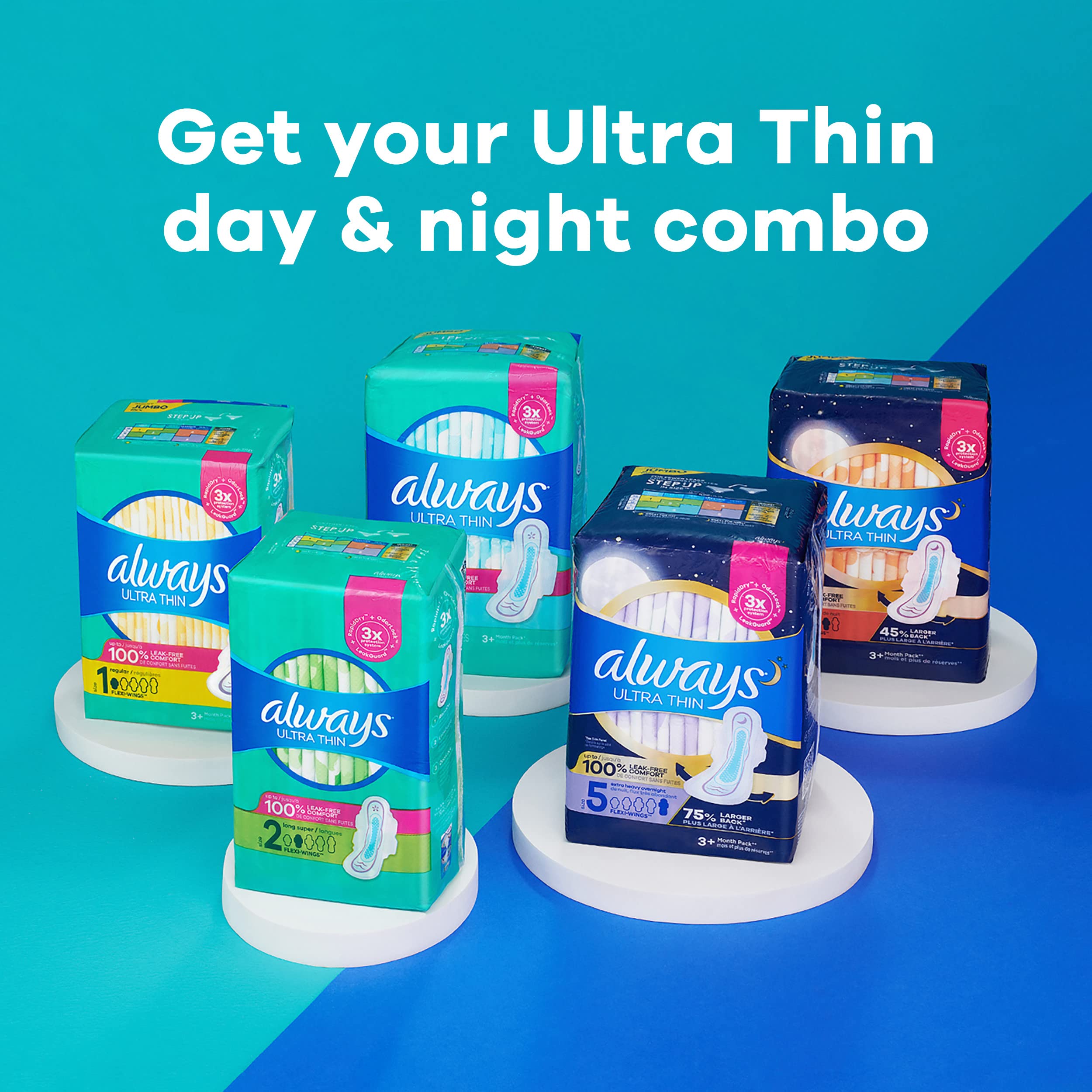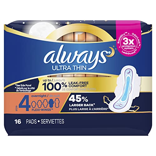 Always Ultra Thin Feminine Pads with Wings for Women, Size 4, Overnight Absorbency, Unscented, Up to 100% Leak-Free Comfort, 16 Count