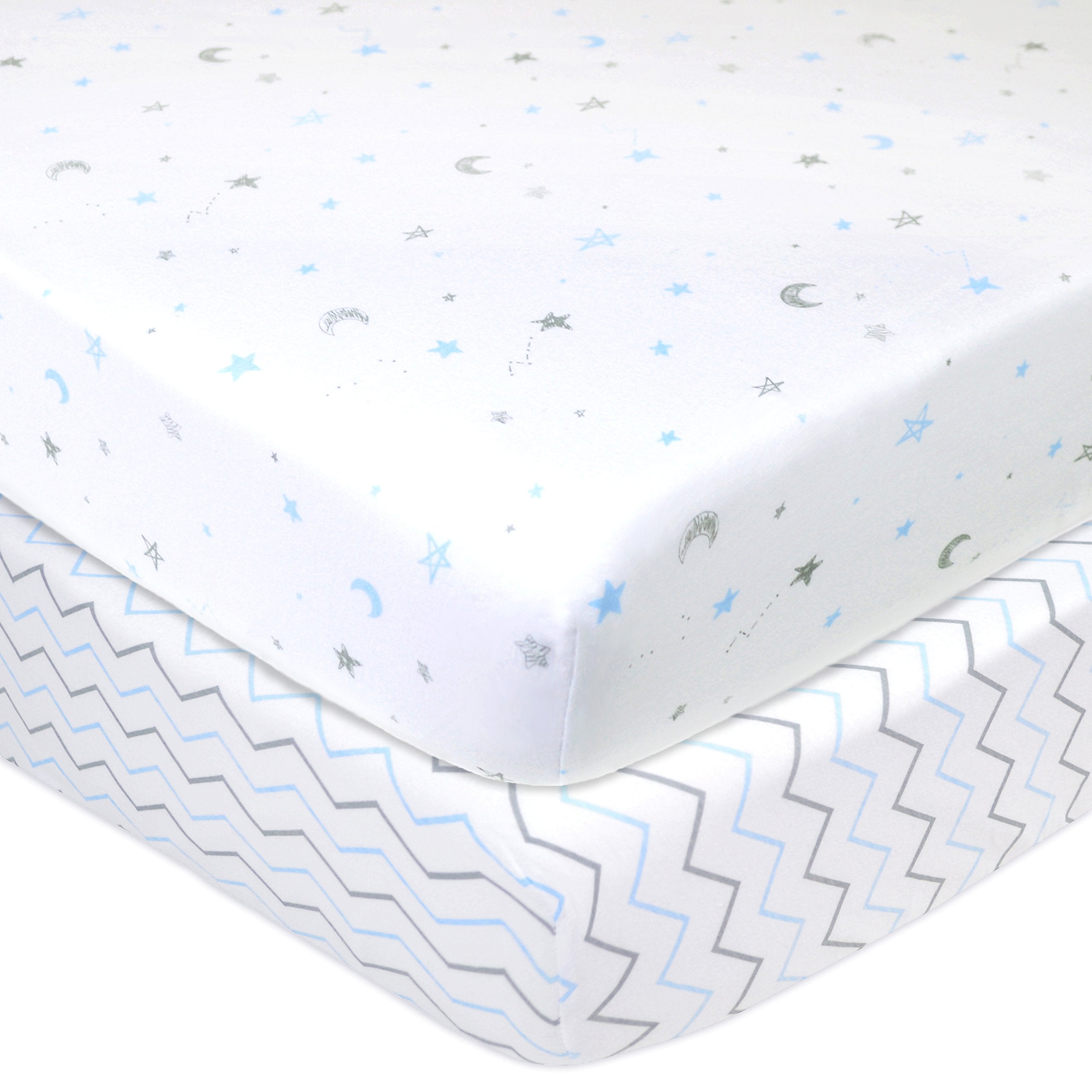 American Baby Company 2 Pack Printed 100% Cotton Jersey Knit Fitted Crib Sheet for Standard Crib and Toddler Mattresses, Blue Stars/Zigzag, for Boys and Girls
