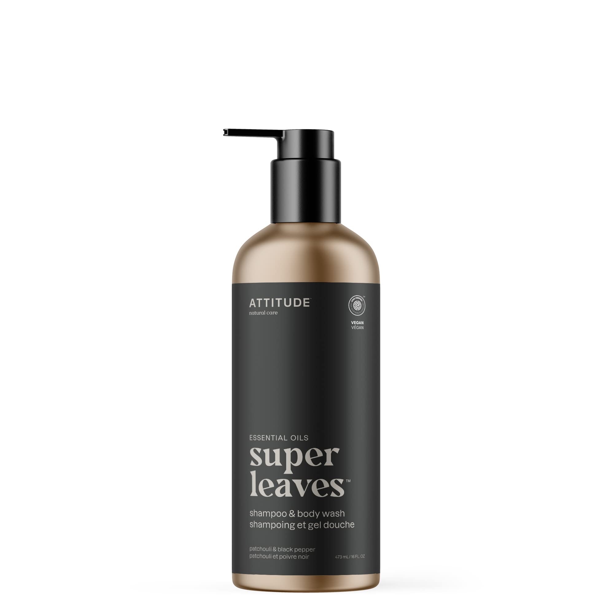 ATTITUDE 2-in-1 Body Wash and Hair Shampoo with Essential Oil, Made in Canada, EWG Verified, Dermatologically Tested, Vegan, Refillable Bottle, Patchouli and Black Pepper, 473 mL