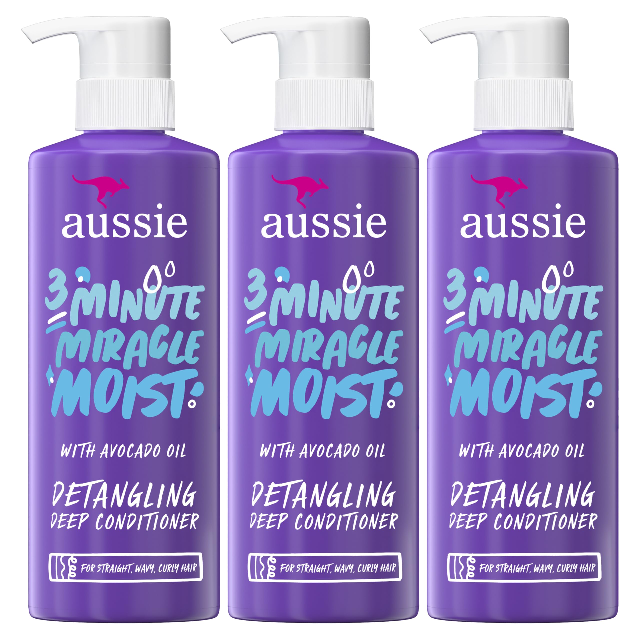 Aussie 3 Minute Miracle Moist Detangling Deep Conditioner Treatment with Avocado Oil, Paraben and Sulfate Free, 1.42 L in Total (3 Count of 475 mL Each)