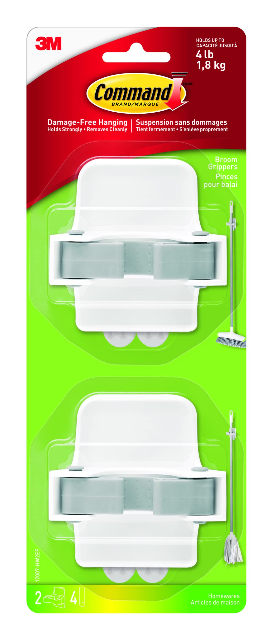 Command Broom and Mop Grippers Wall Hook, Damage Free Hanging Wall Mount Broom and Mop Holder, No Tools Household Cleaning Organizer for Living Spaces, 2 Hangers and 4 Command Strips