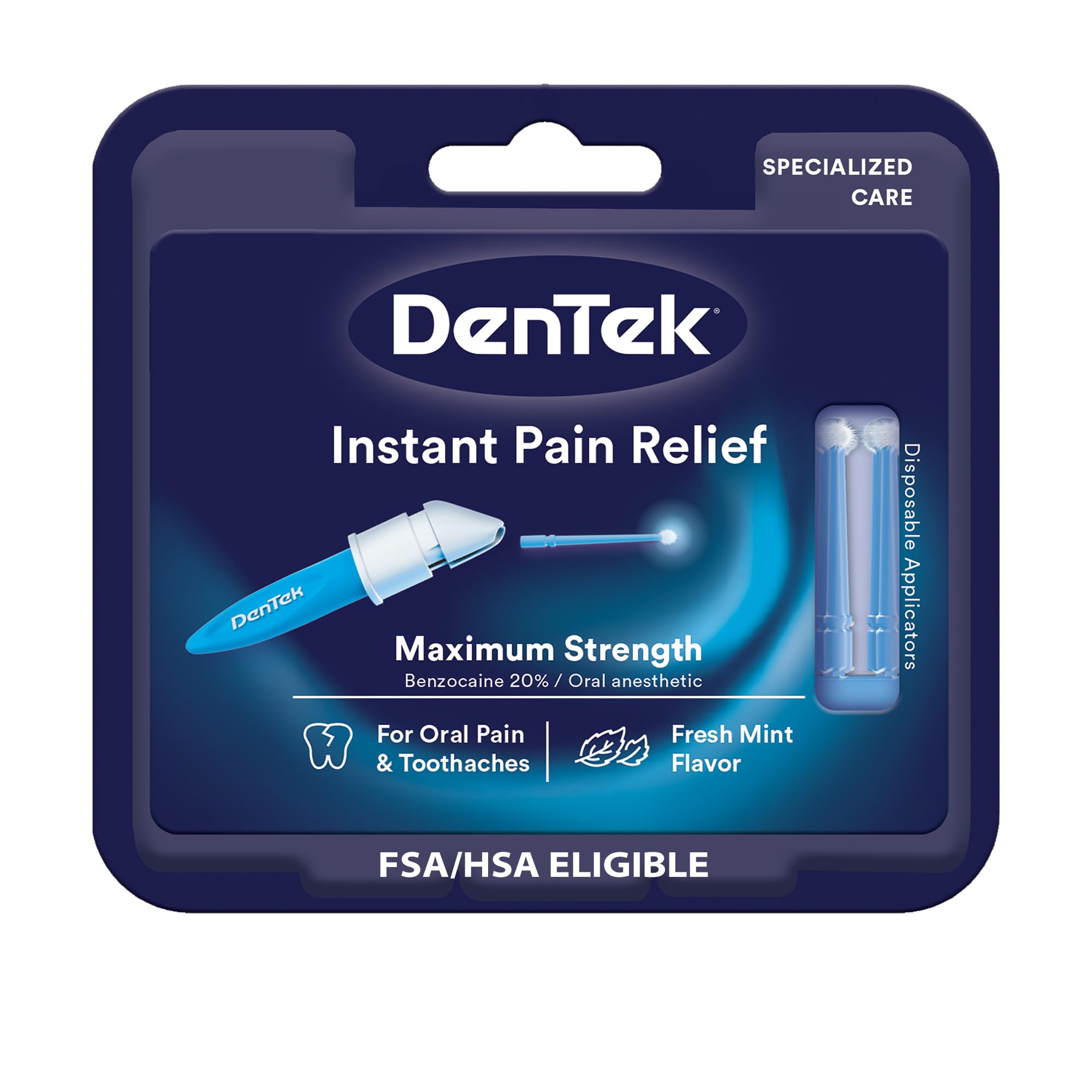 DenTek Instant Pain Relief, Advanced Kit is an adult oral pain relief kit providing a new, sanitary way to apply Benzocaine for toothache relief. It's simple to measure one dose and easy to apply. Avoid using fingers and mess to apply the oral anesthetic with the single-use applicators and handle. Use the oral pain relief for quick and easy relief of toothaches, sore gums, canker sores and cold sores. The maximum strength and instant pain-relieving power of Benzocaine is what dentists recommend for toothaches and gum pain. The disposable applicator is a simple, sanitary dental pain relief. Use it at home or bring it for on-the-go pain relief with the carrying case included in the kit. It features one bottle of Benzocaine, 50 disposable applicators, an applicator handle and a carrying case. Go beyond brushing with DenTek! Help preserve and protect your teeth for a lifetime with DenTek's innovative dental care products.