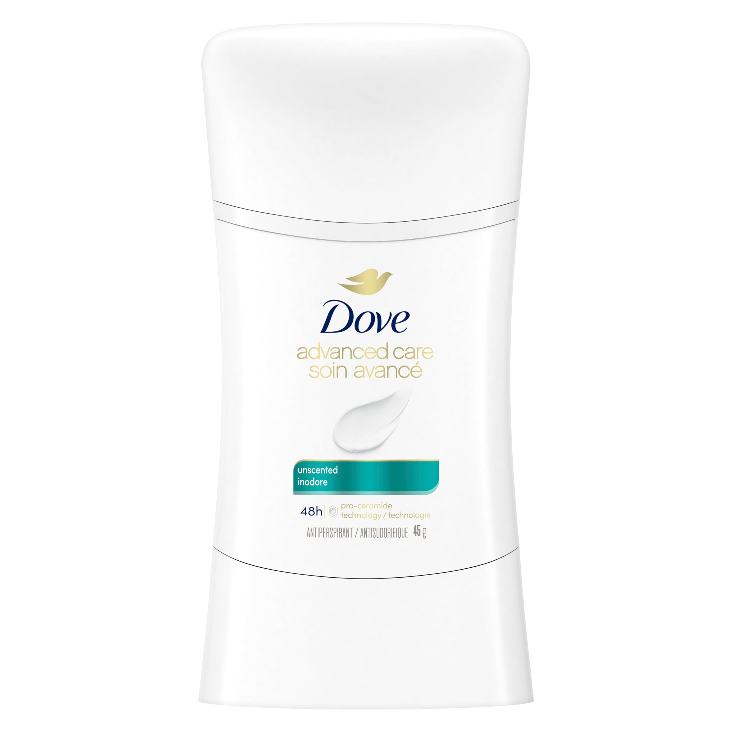Dove Advanced Care Unscented Antiperspirant Deodorant for Women with Pro-Ceramide Technology for Soft, Resilient Skin, 45g