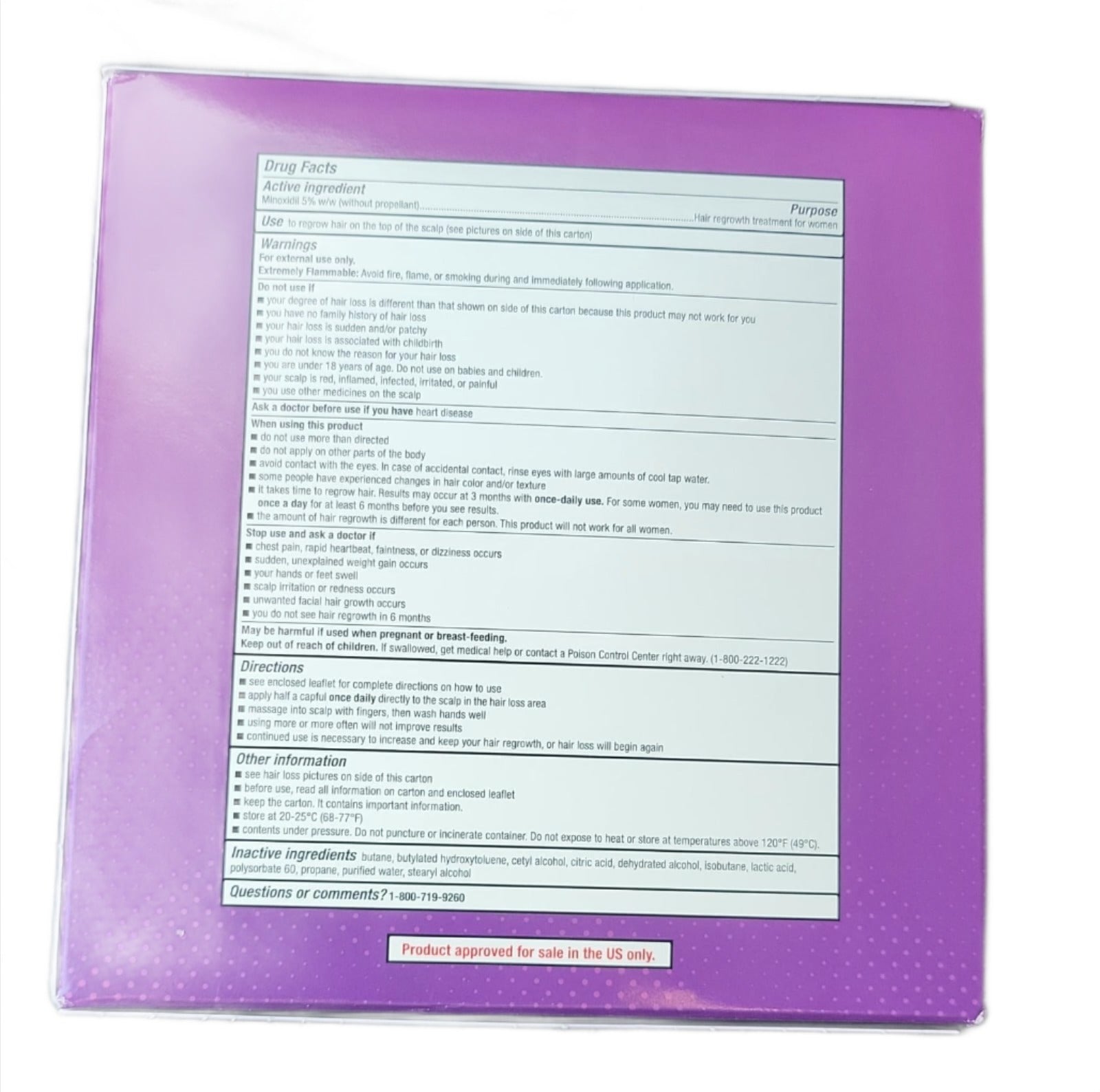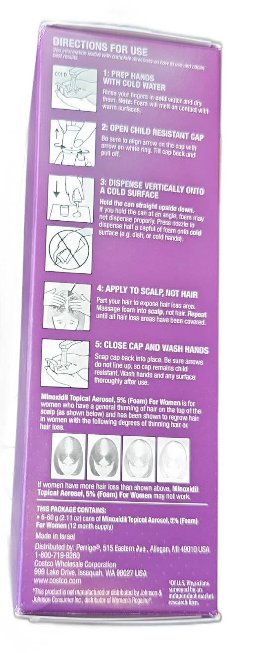 Minoxidil Topical Aerosol, 5% (Foam) is a hair regrowth treatment for women. The active ingredient is minoxidil 5%. This unscented, easy-to-use foam topical treatment revitalizes hair follicles and is clinically proven to help regrow hair. This product is not for use by men. It is not intended for frontal baldness or receding hairline. Minoxidil Topical Aerosol, 5% (Foam) is for women who have a general thinning of hair on the top of the scalp.