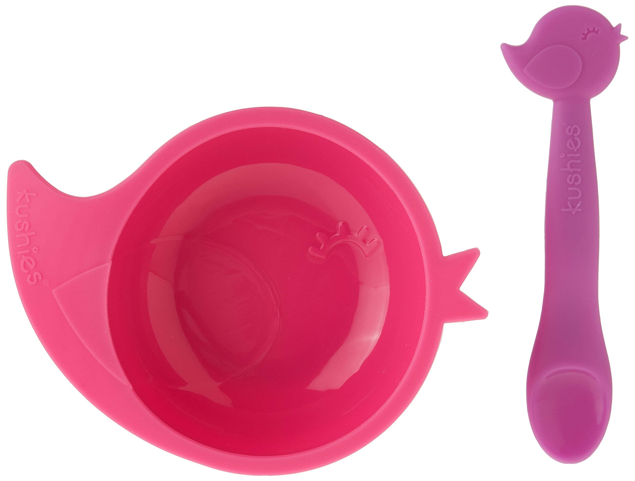 SILIBOWL + SPOON SET by Kushies Cute Silicone Bowl with Suction and Spoon Set for Babies, Toddlers, and Kids, Non-Slip, Dishwasher, Microwave, Freezer, and Oven Safe, BPA, PVC, and Phthalate Free - Pink Bird