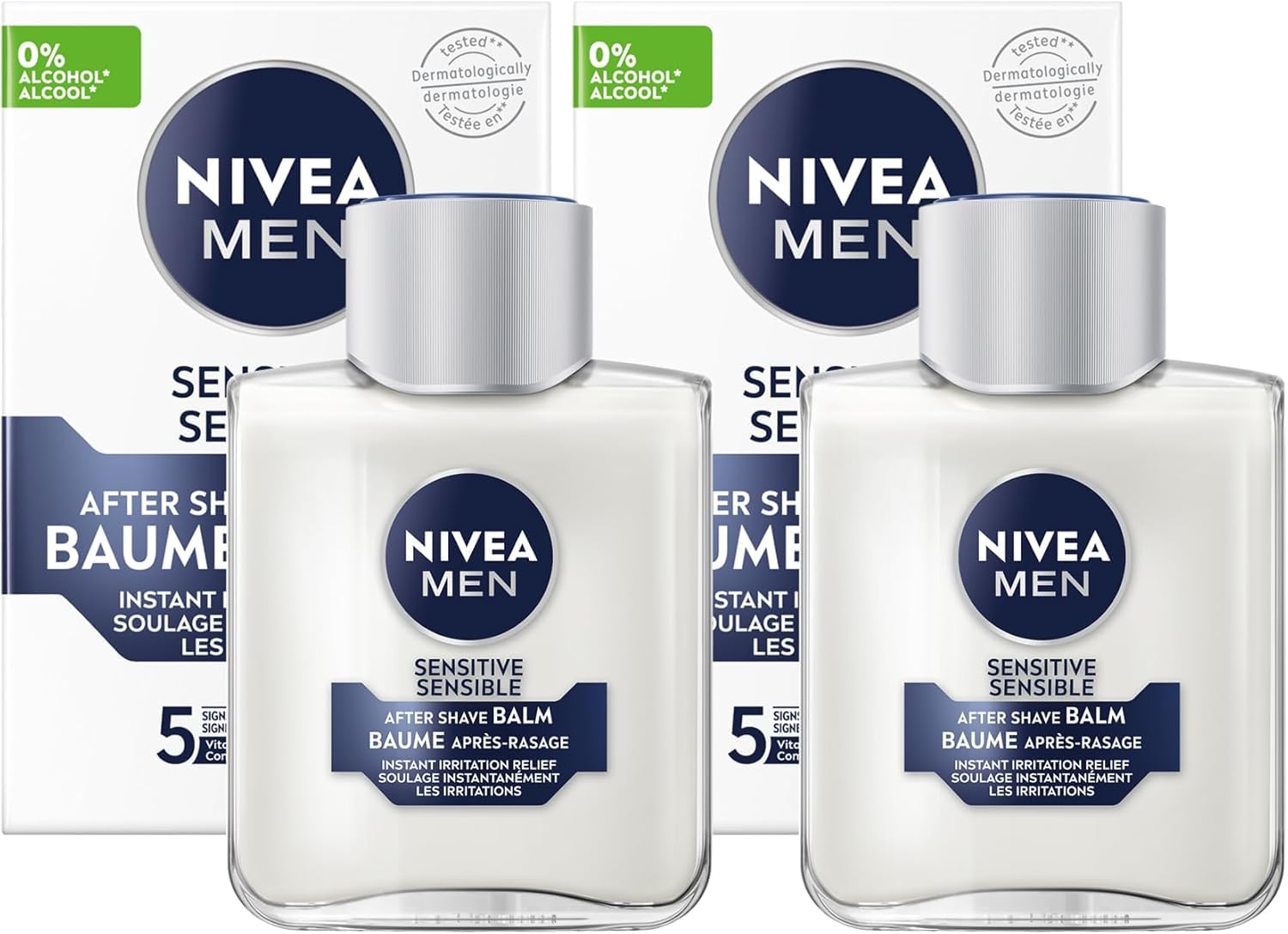 NIVEA MEN Sensitive Skin After Shave Balm, After Shave for Men with Sensitive Skin, No Drying Alcohol, Aftershave Instantly Soothes & Protects, Dermatologically-Tested Skin Care, 2 x 100 mL