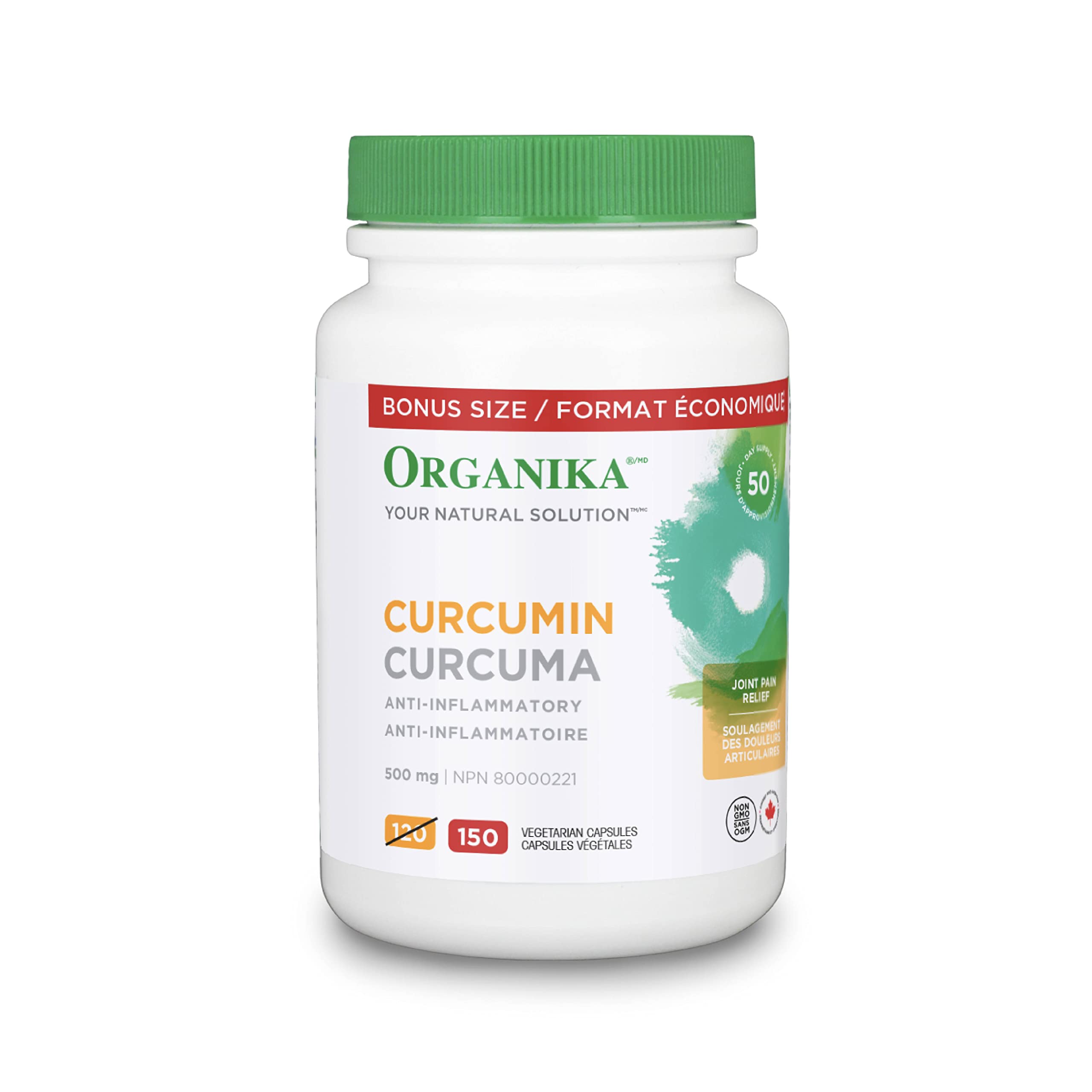 Organika Canadian-Made Curcumin 500 mg - Anti-Inflammatory, Antioxidant, Joint Pain Relief and Natural Tonic - 150 vcaps