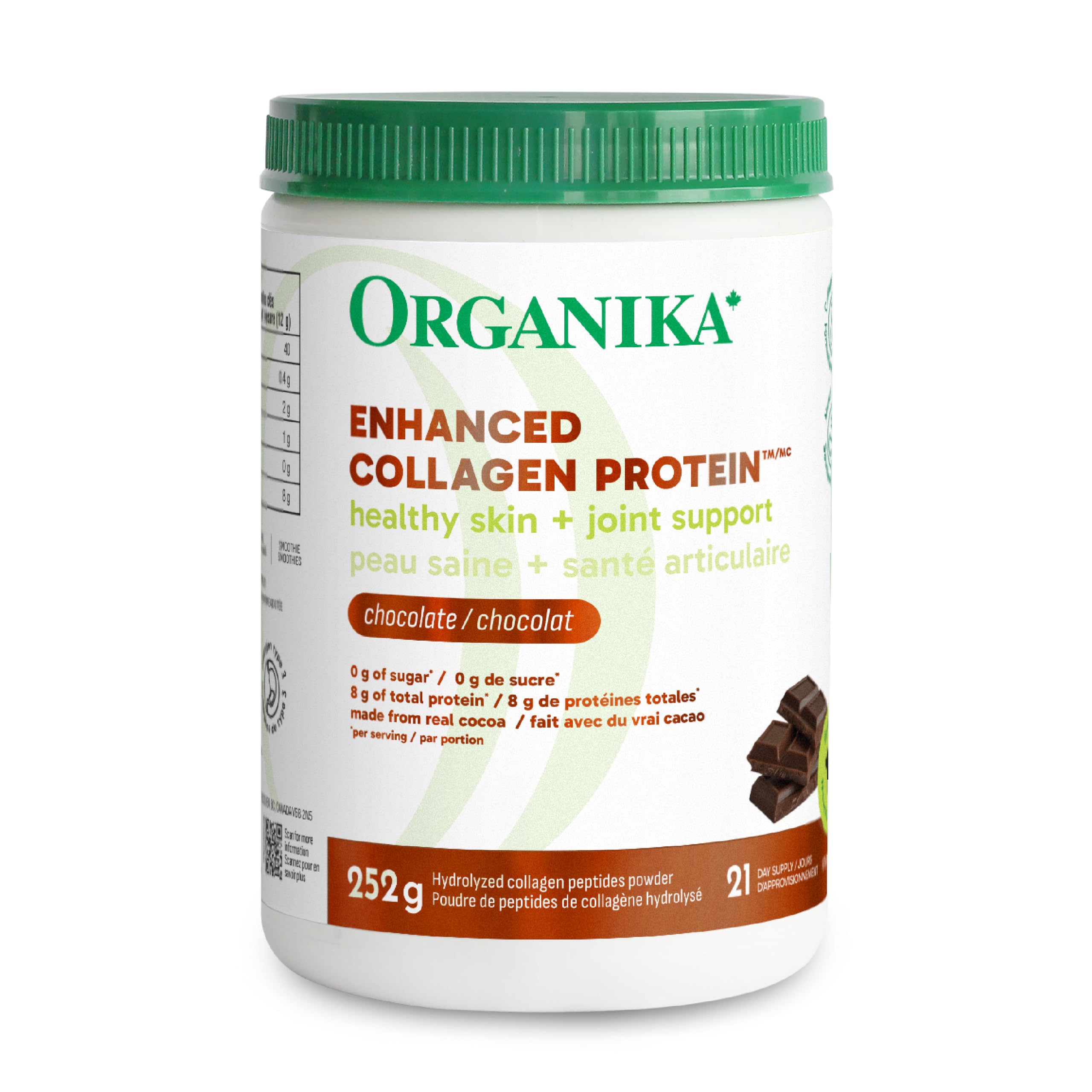 Organika Canadian-Made Chocolate Enhanced Collagen - Grass-Fed Collagen with Real Cocoa, Sugar-Free, Healthy Hair, Skin, Nails, Joints - 252g