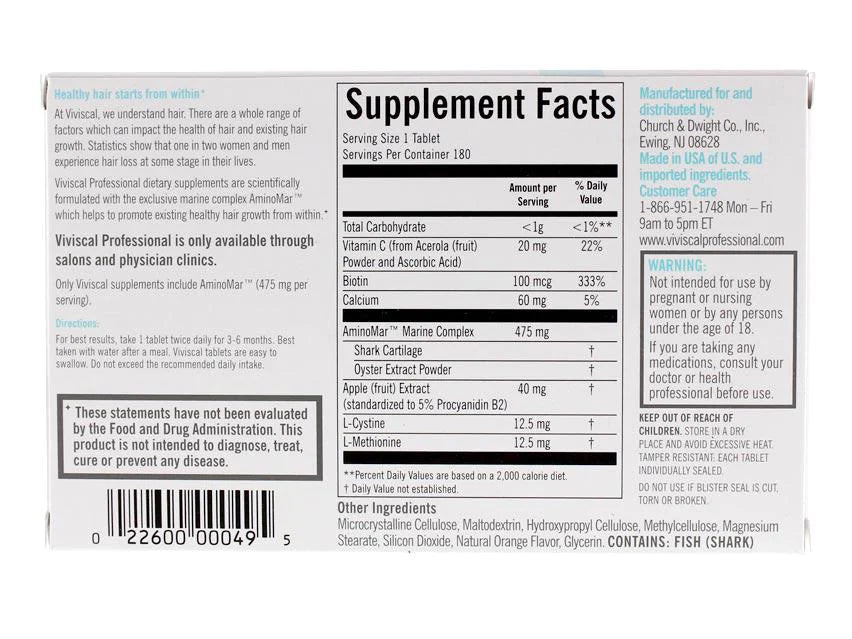 Viviscal Professional Supplements contain even more of the proprietary marine complex AminoMar than any other formula, plus they include apple extract, L-Cysteine and L-Methionine, ingredients that are not found in any other Viviscal product. Professional Supplements are sold exclusively through physicians' offices, clinics and physician-owned and operated websites such as LovelySkin, and they are backed by 20 years of clinical research.