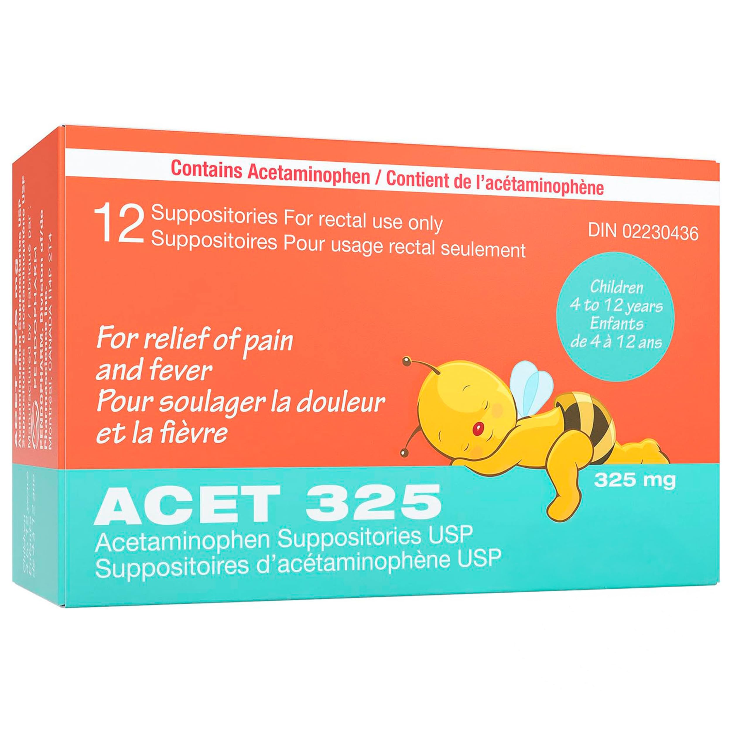ACET Acetaminophen Suppository 325mg - Fever & Pain Relief for Children (4-12 Years) - 12 Count, White, Disposable, Rectal Use Only