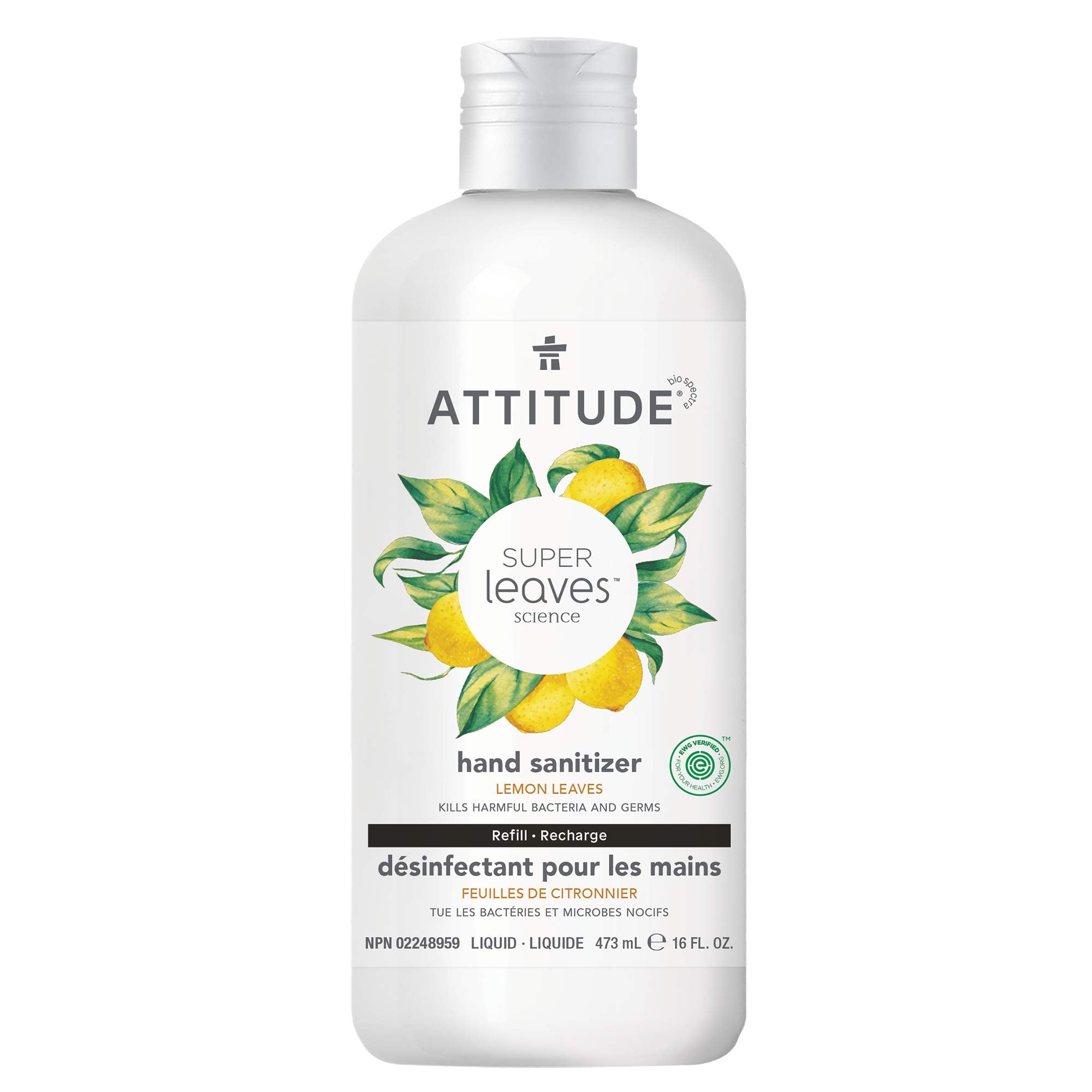 ATTITUDE Hand Sanitizer Refill, EWG Verified, Kills Germs & Bacteria, Vegan & Plant-Based, Safe for Adults & Kids, Lemon Leaves Scent, 473 mL