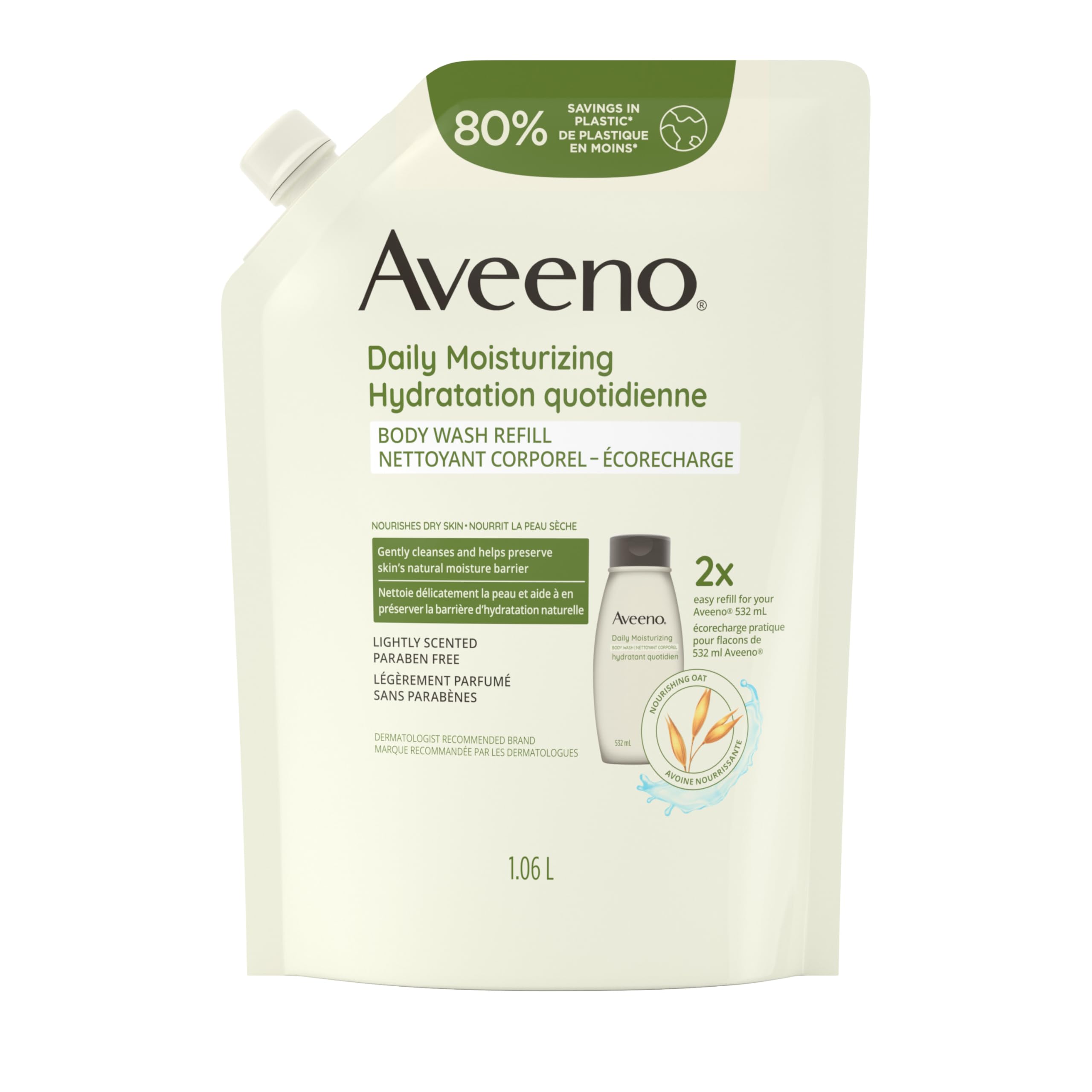 Aveeno Daily Moisturizing Body Wash for Dry & Sensitive Skin with Prebiotic Oat, Hydrating Oat Body Wash Nourishes Dry Skin & Gently Cleanses, Light Fragrance, Sulfate-Free, 1.06L, Refill Pack