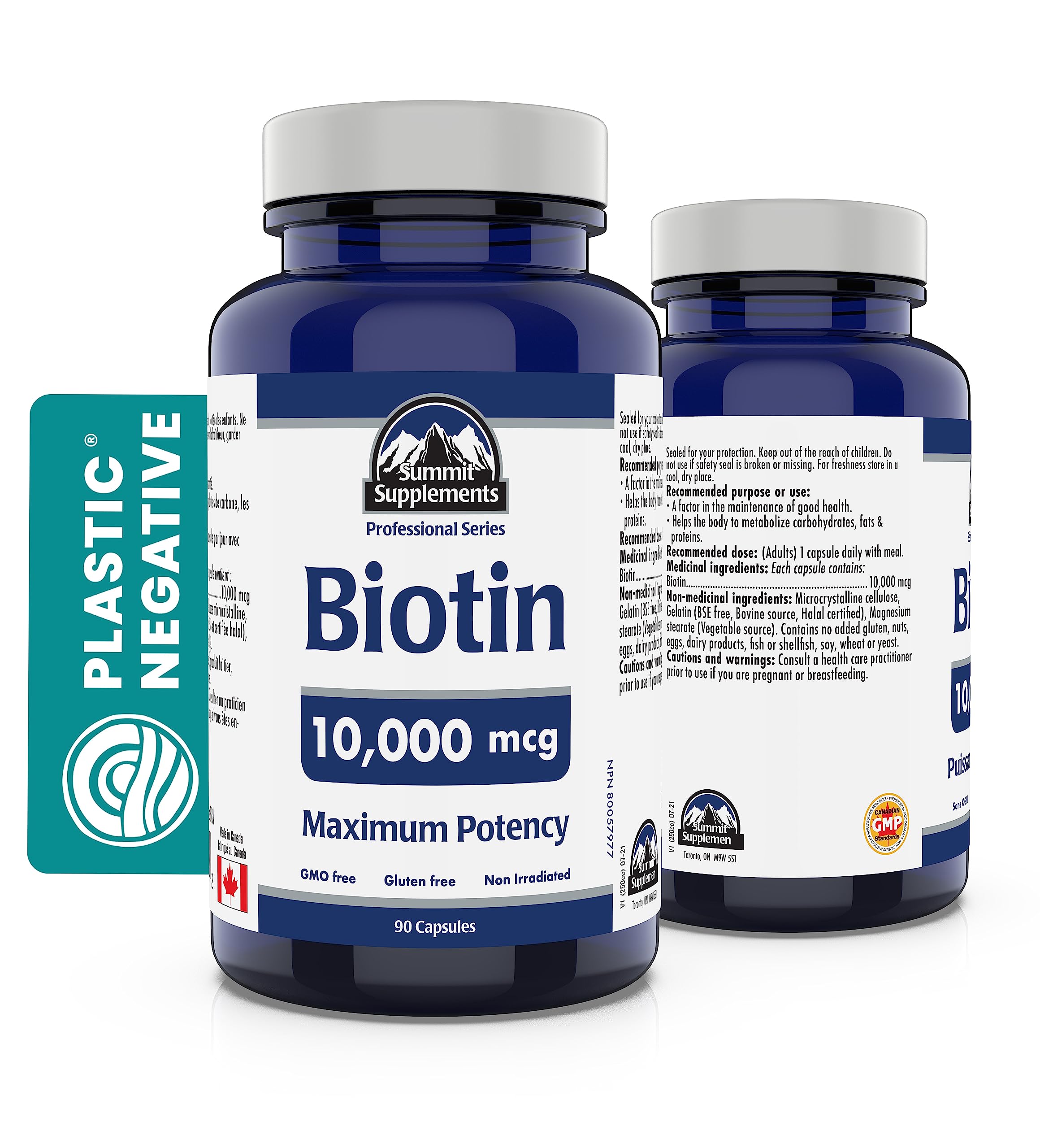 Biotin 10,000 mcg, 90 Vegan Capsules, 90-Day Supply, Maximum Potency Water-soluble Vitamin, Promotes Hair Growth, Stronger Nails & Healthier Skin, GMO & Gluten-Free, Proudly Canadian, Plastic Negative