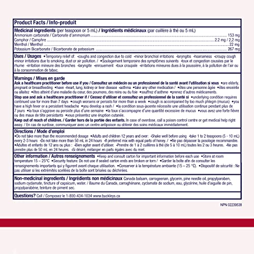 Effective relief of coughs and congestion due to colds, minor bronchial irritations, laryngitis, hoarseness, croupy cough and minor irritations due to smoking, dust or air pollution. SHAKE WELL BEFORE USING. Directions: To be taken every 2 - 3 hours as required. Adults and children over 12 years old: 1 to 2 teaspoons (5 to 10 milligram). Do not exceed 5 doses daily. If preferred, mix with equal parts honey. Active Ingredients: Each teaspoonful (5 milligram) contains: 153 milligram ammonium carbonate, 267 milligram potassium bicarbonate, 22 milligram menthol, and 2.2 milligram camphor. Non-Medicinal