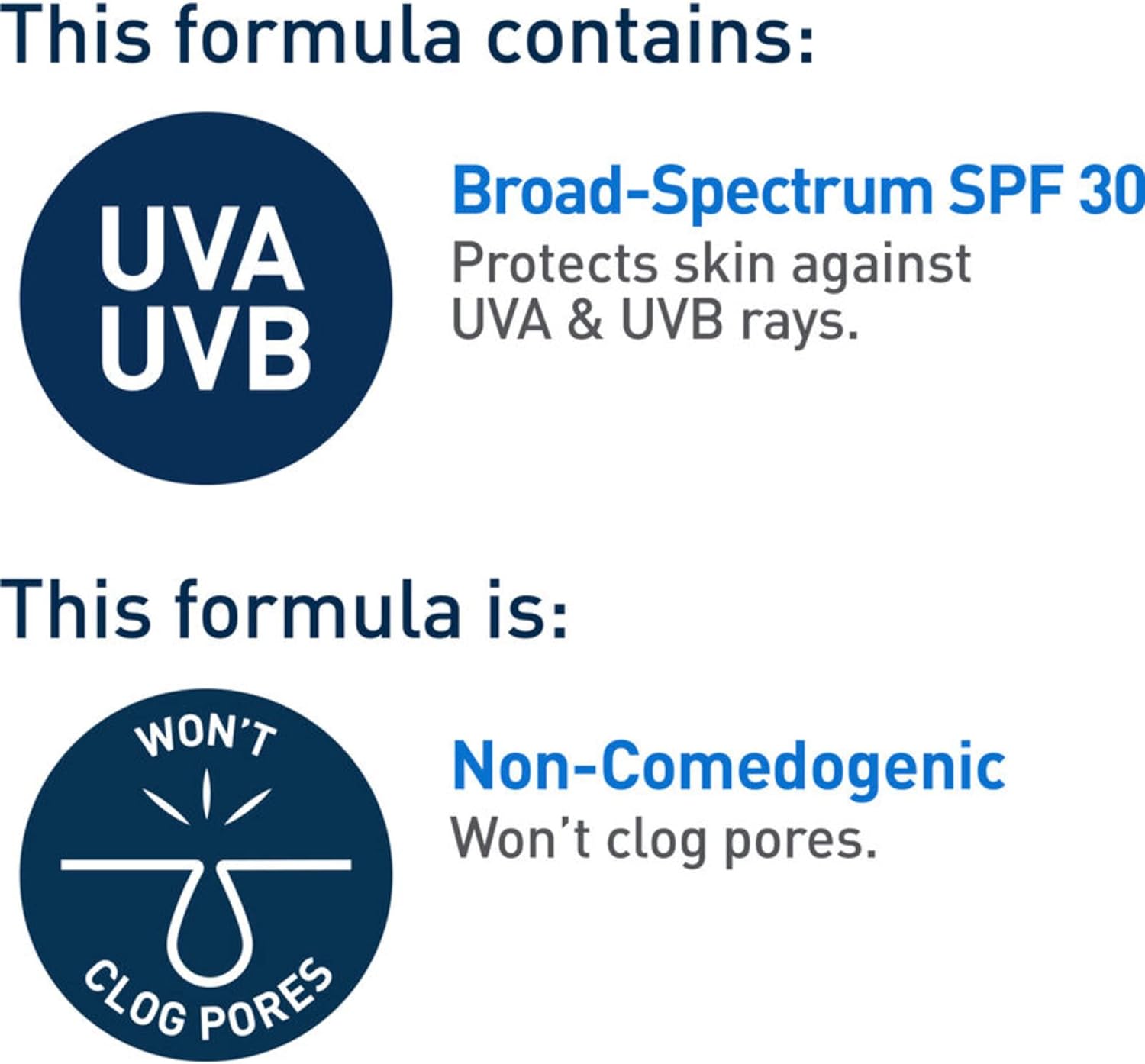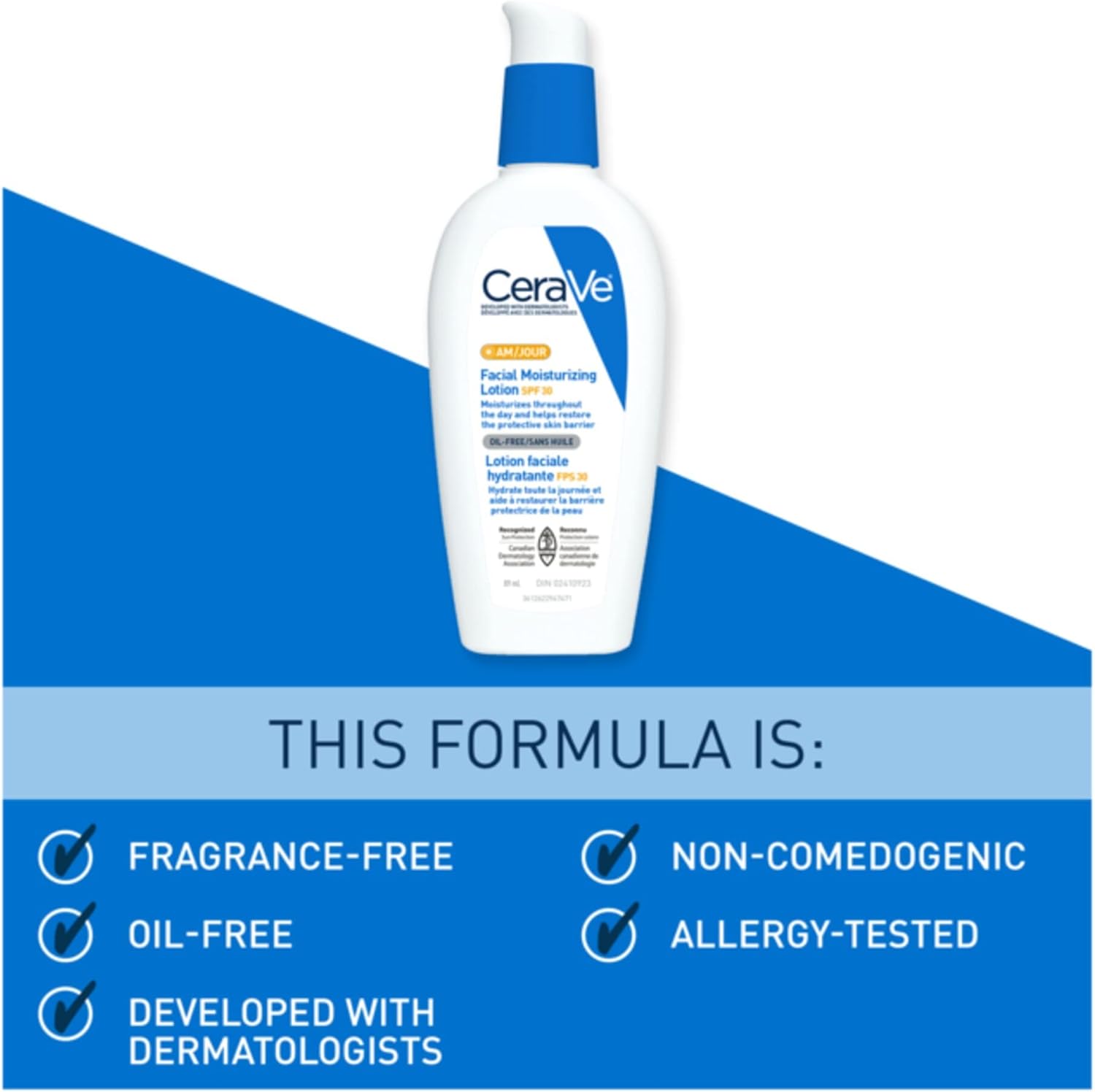 Developed with dermatologists, CeraVe am facial moisturizing lotion with broad-spectrum SPF 30 moisturizes throughout the day and helps restore the protective skin barrier with three essential ceramides (1, 3, 6-ii). the formula also contains hyaluronic acid to help retain skin's natural moisture.