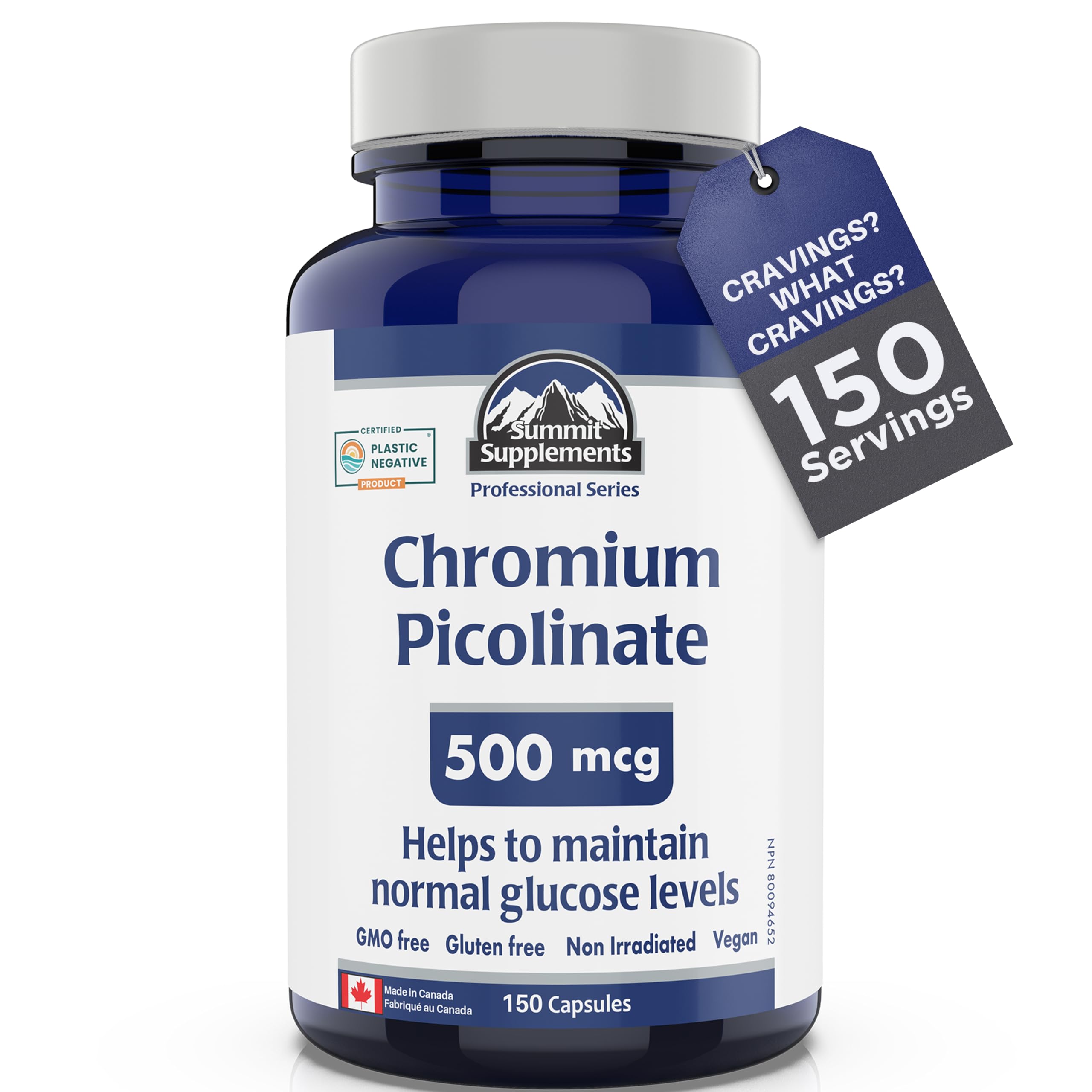 Chromium Picolinate 500mcg 150 Vegan Caps, 150-Day Supply, Supports Glucose Metabolism, Appetite & Craving Management, Metabolic & Muscle Support, GMO & Gluten-Free, Plastic Negative, Proudly Canadian