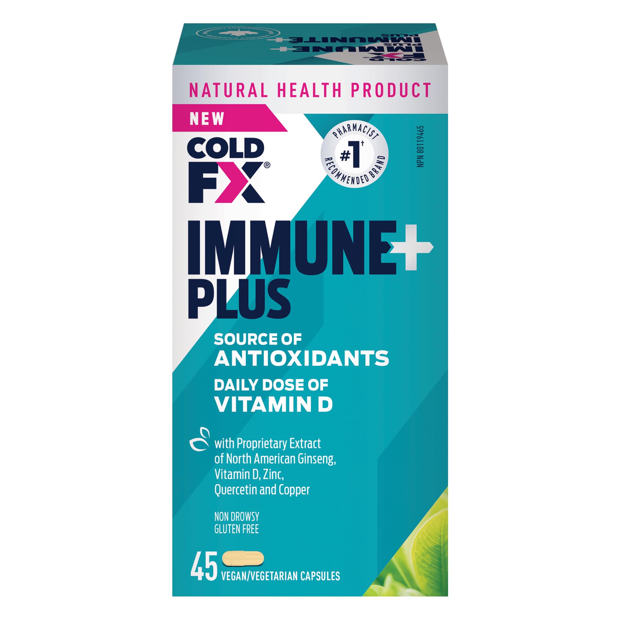 Cold-FX Immune+ Plus, with proprietary extract of North American Ginseng, Vitamin D, Zinc, Quercetin and Copper, Helps reduce Chance Cold and Flu, Immune System Support, 45 Vegan Vegetarian Capsules