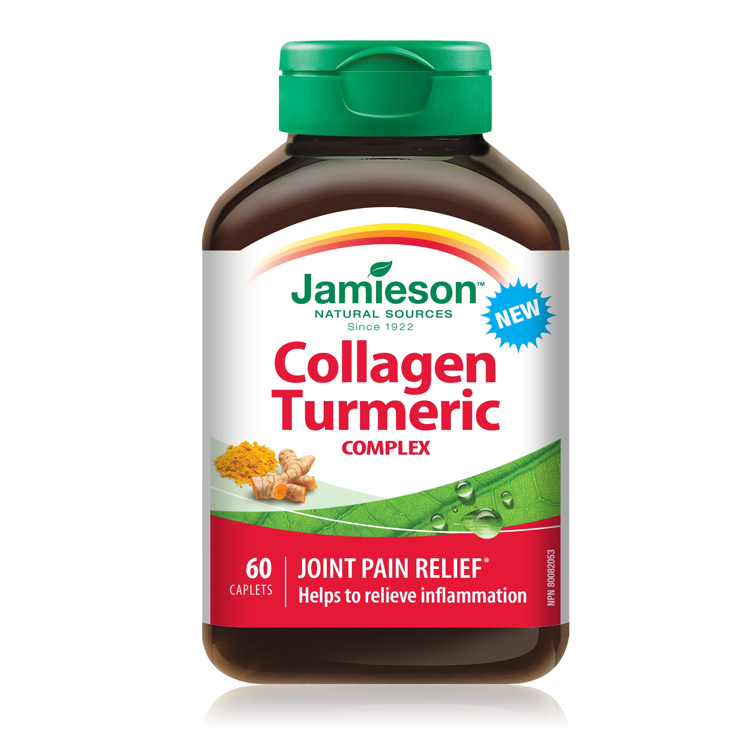Jamieson Collagen Turmeric Complex, with 600 mg Collagen, Anti-inflammatory, Provides Joint Pain Relief and Digestive Support. Gluten-Free, No Artificial Colours, Flavours, or Preservatives, 60 Caplets, Proudly Canadian
