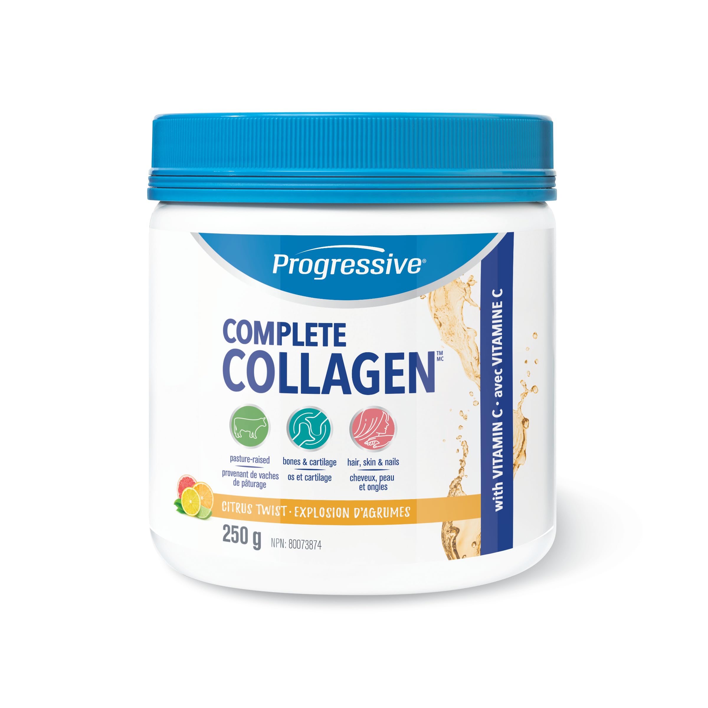Progressive Complete Collagen Citrus Twist, Canadian-Made, for Healthier Hair, Skin, Nails and Joints. Grass-Fed Non-GMO with Antioxidants, Hydrolyzed with Vitamin C for Best Absorption, 250 g