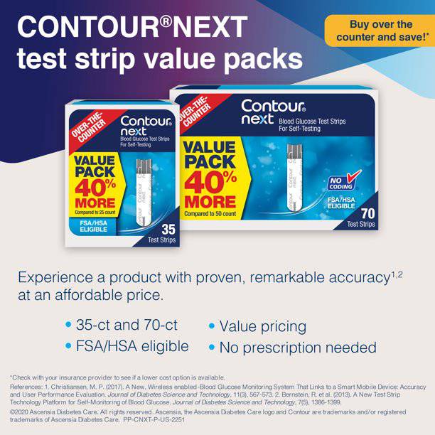 Make daily testing easier with Bayer Contour Next Blood Glucose Test strips. Monitoring blood sugar levels is a daily task when you're living with Type-A/insulin-dependent diabetes. Bayer Contour Next Meters simplifies self-monitoring; Contour Next glucose test strips are an essential part of Bayer's system. The plastic strips are easy to use, provide insight on test results, and can be used without coding. They are designed to deliver proven accuracy and fast test time, so you can maintain peak insulin levels with ease. The disposable design empowers effortless, everyday use. The Contour Next test strips 100 count pack can be stored between 41 and 86 degrees Fahrenheit. They're FSA and HSA-eligible to help keep costs low.