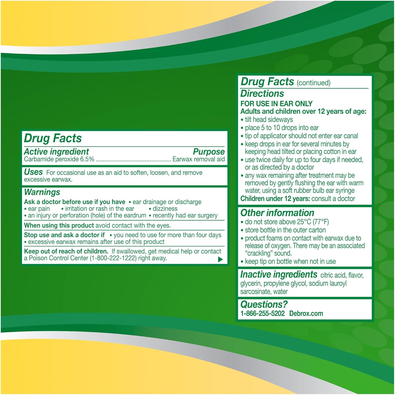 Debrox Ear Wax Removal Drops are the number one doctor- and pharmacist-recommended ear wax removal brand* because they’re a safe and convenient in-home solution to clogged ears from excessive ear wax. Ear wax build up can be caused by frequently wearing ear buds, in-ear headphones, hearing aids, or ear plugs. Excessive ear wax build up can lead to ear discomfort and reduced hearing, which can affect your day-to-day life. Debrox is easy to use and starts working immediately; simply put 5-10 drops in the ear so the gentle, non-irritating microfoaming action can go to work softening and loosening ear wax. After using Debrox, ear wax can drain from the ear and ears are relieved from built-up ear wax so you can return to daily life without muffled hearing caused by excess ear wax. Trust Debrox to help keep your ears – and hearing – clear with the ear wax remover recommended most by doctors and pharmacists. Also available in a convenient ear wax removal kit featuring a soft rubber bulb syringe to rinse your ear after using Debrox Ear wax Removal Drops. *IQVIA Claim Substantiation Validation Statement, 12/1/21 - 11/30/22; Pharmacy Times 2023 Annual Pharmacists Survey