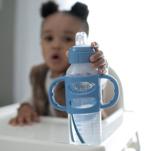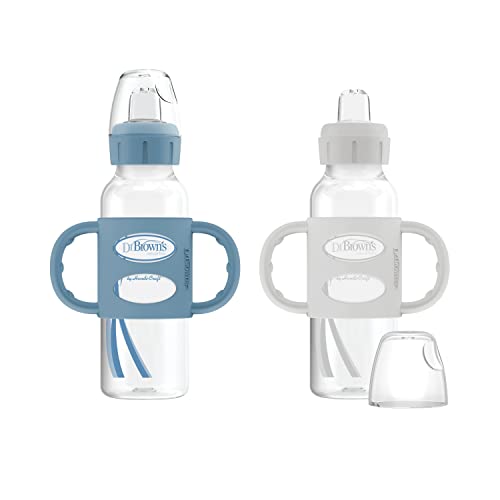 Dr. Brown’s Milestones Narrow Sippy Bottle with 100% Silicone Handles, Easy-Grip Bottle with Soft Sippy Spout, 8oz/250mL, 6m+, Light-Blue and Gray, 2-Pack, BPA free