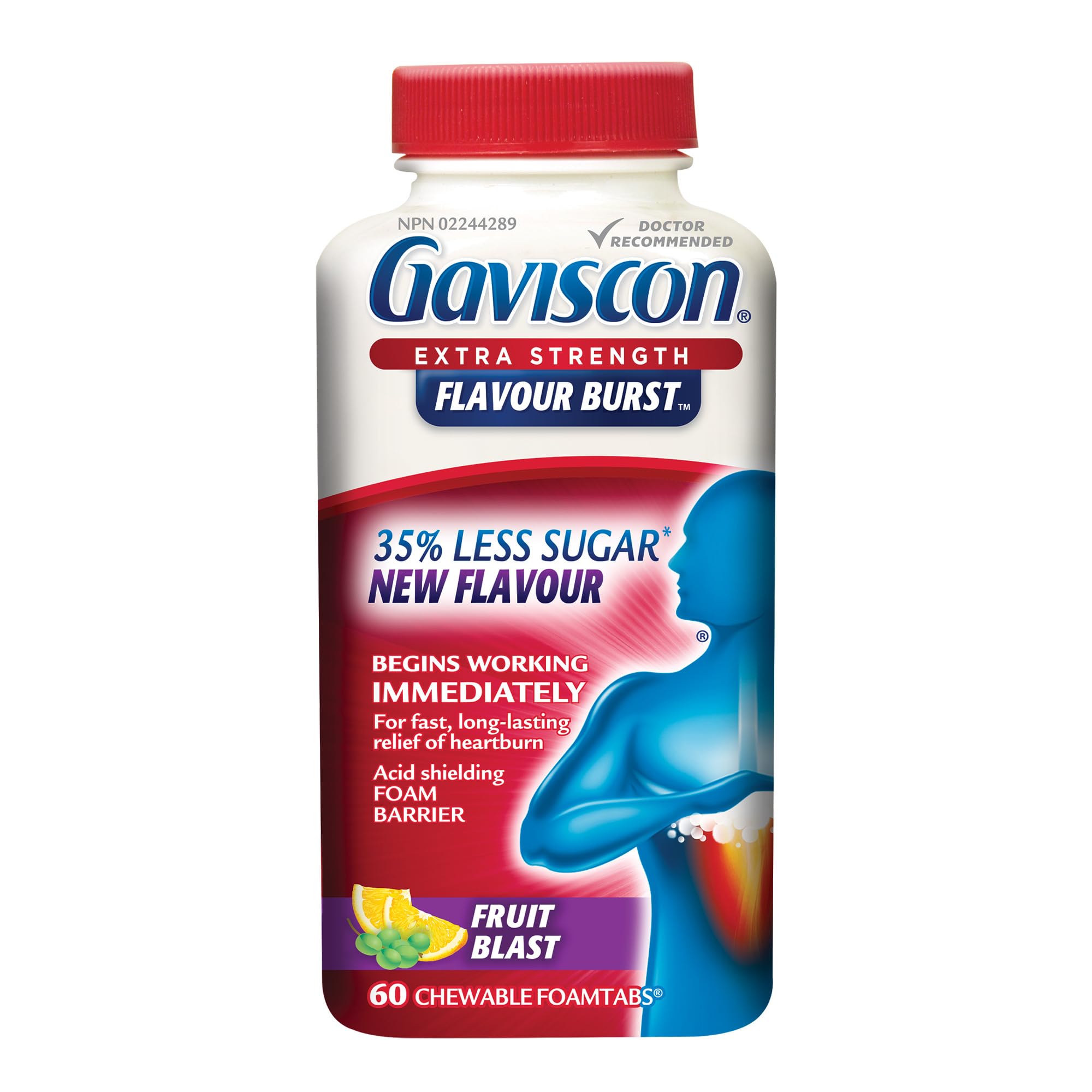Gaviscon Extra Strength Flavour Burst Tablets - 60 Count - Chewable Foaming Antacid Tablets for Day and Night Heartburn Relief, Acid Reflux and GERD Relief, Fruit Blast - Free of Aluminum, Lactose and Gluten