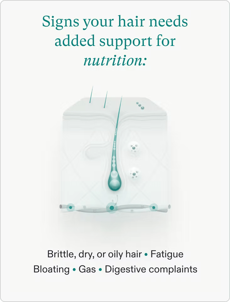 INDICATIONS: To be taken with Nutrafol clinically effective hair growth nutraceuticals. For adults wanting to improve their gut and hair health. For adults experiencing generalized hair thinning, taking or having taken antibiotics, with nutrient deficiencies that contribute to hair thinning or with digestive or skin complaints with concomitant hair thinning.