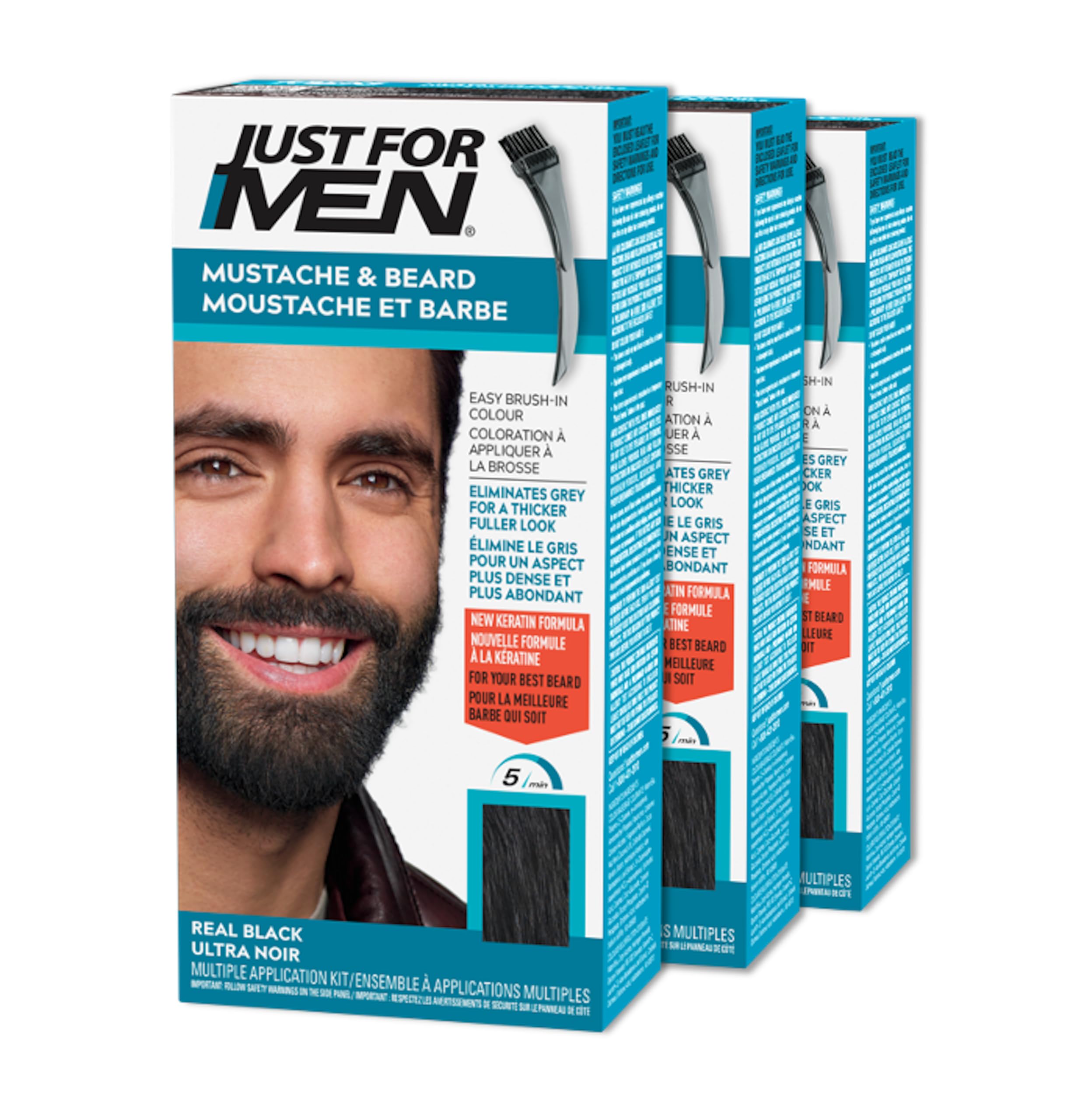 Just For Men Mustache & Beard, Beard Dye for Men with Brush Included for Easy Application, With Biotin Aloe and Coconut Oil for Healthy Facial Hair, Real Black, M-55 (3 Count), Packaging May Vary