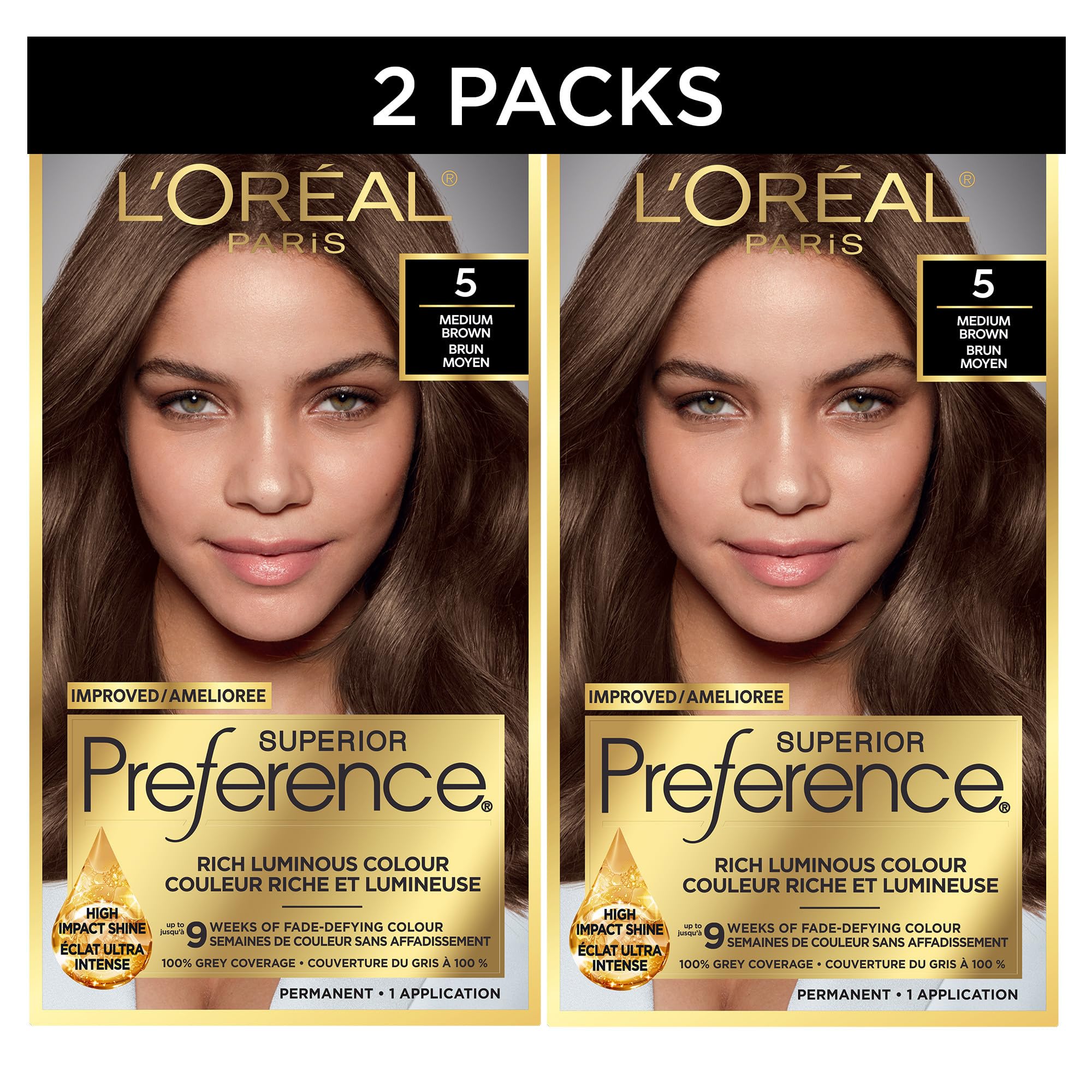 L'Oreal Paris Superior Preference Hair Dye, Hair Color for Women, 5 Medium Brown Hair Dye, Permanent Hair Color, 100% Grey Coverage, 9 weeks of Luminous Fade-Defying, 1 Hair Dye Kit (Pack of 2) (Packaging May Vary)