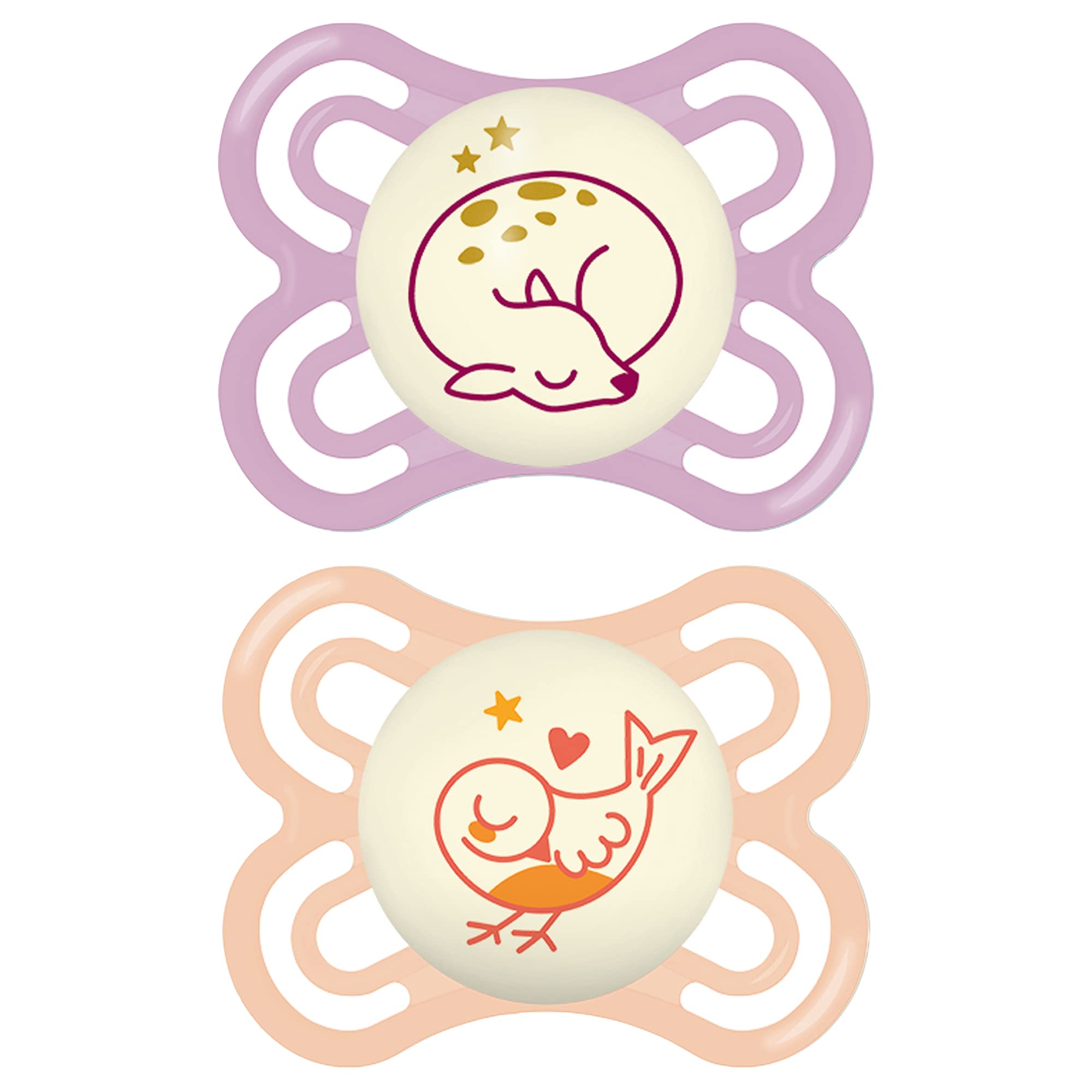 MAM Perfect Night Pacifiers (2 Pacifiers & Sterilizing Box), MAM Soother with a Silicone Nipple, Glow in the Dark Pacifiers, Baby Essentials, Girl, 0-6 Months