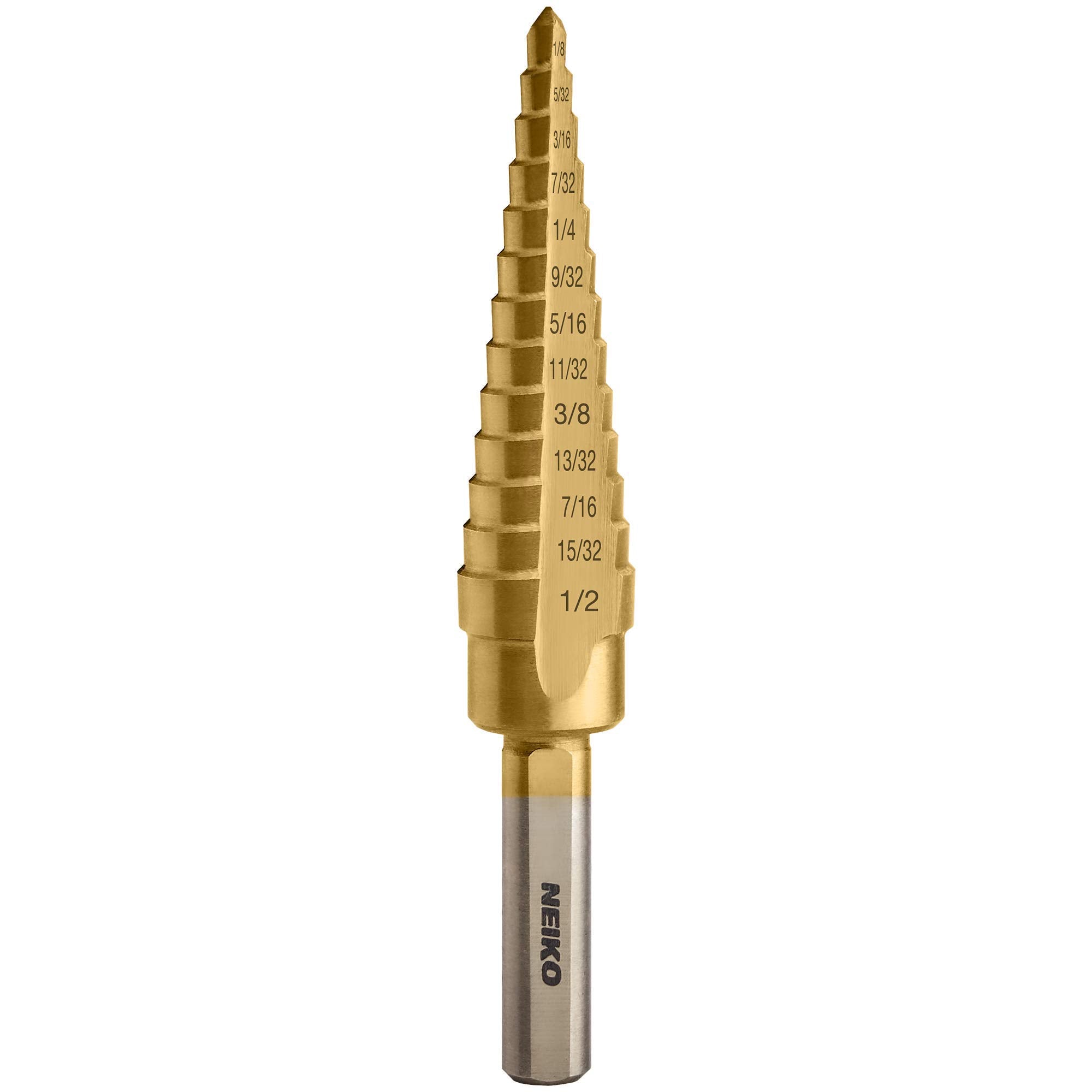 NEIKO 10182A Titanium Step Drill Bit, High-Speed Alloy-Steel Bit, Hole Expander for Wood and Metal, 13 Step Sizes from 1/8 Inch to 1/2 Inch