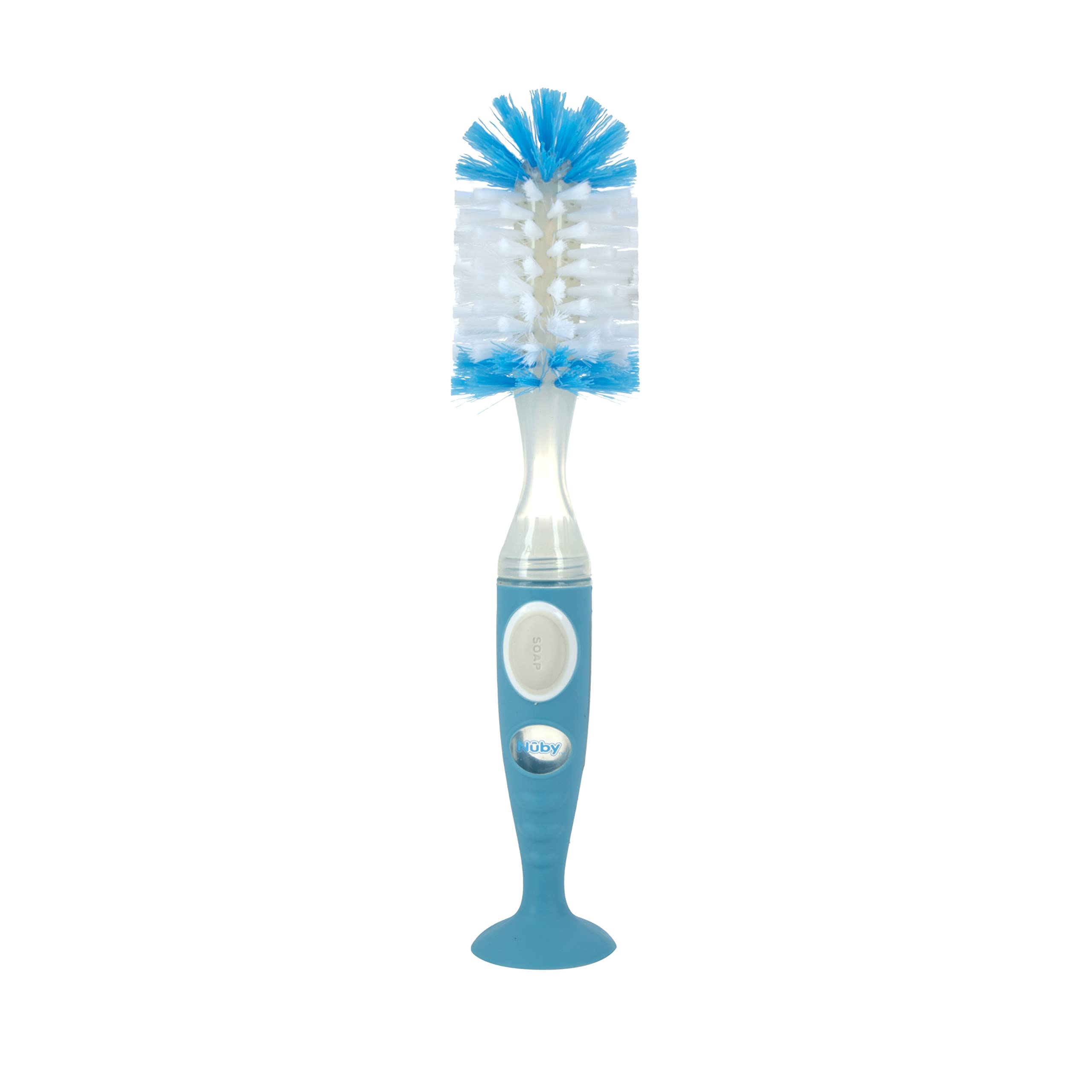 Nuby Easy Clean Dispensing Soft and Durable Bristle Bottle Brush with Textured Handles and Suction Base, 2 in 1 System, Blue