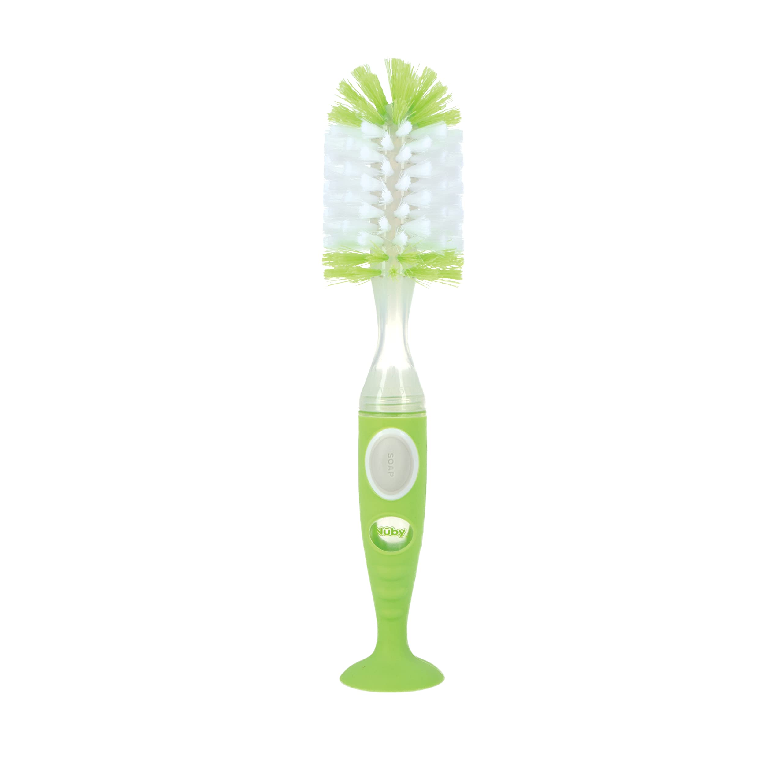 Nuby Easy Clean Dispensing Soft and Durable Bristle Bottle Brush with Textured Handles and Suction Base, 2 in 1 System, Green