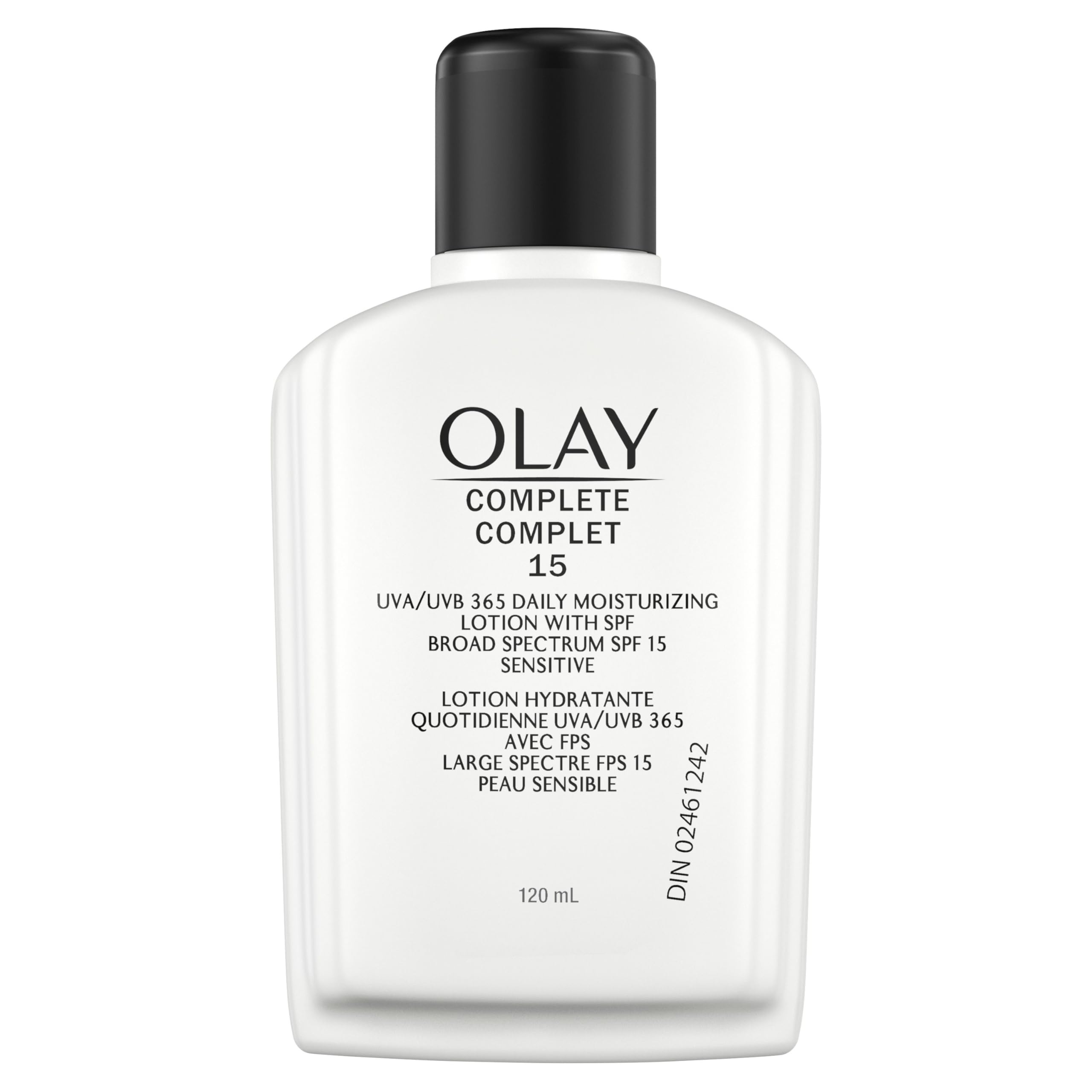 Olay Face Moisturizer, Complete with Sunscreen SPF 15, For Sensitive Skin, Fragrance Free, Daily Facial Lotion, Lightweight Hydrating Broad Spectrum Sun Protection - Vitamin C, E, and Niacinamide, 120 mL