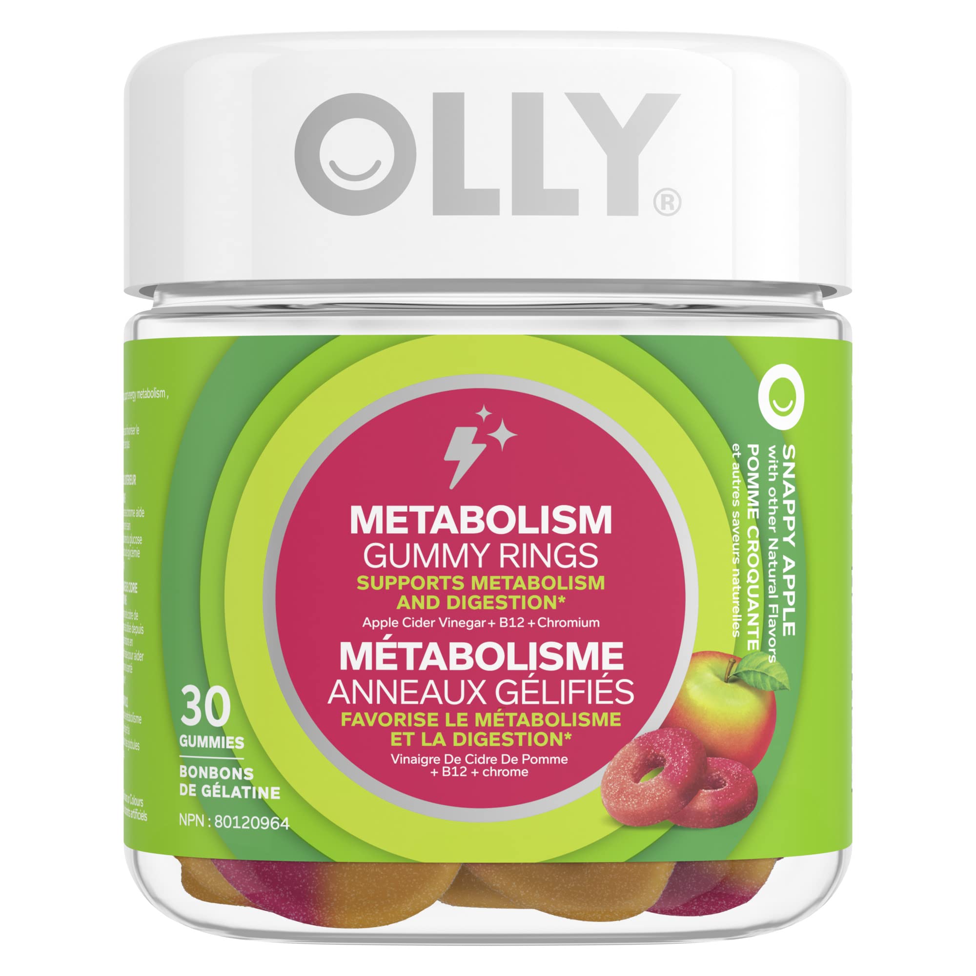 OLLY Metabolism Gummy Rings supports metabolism and digestion* Snappy Apple with apple cider vinegar, vitamin B12 & chromium 30 gummies, 30 count (Pack of 1)