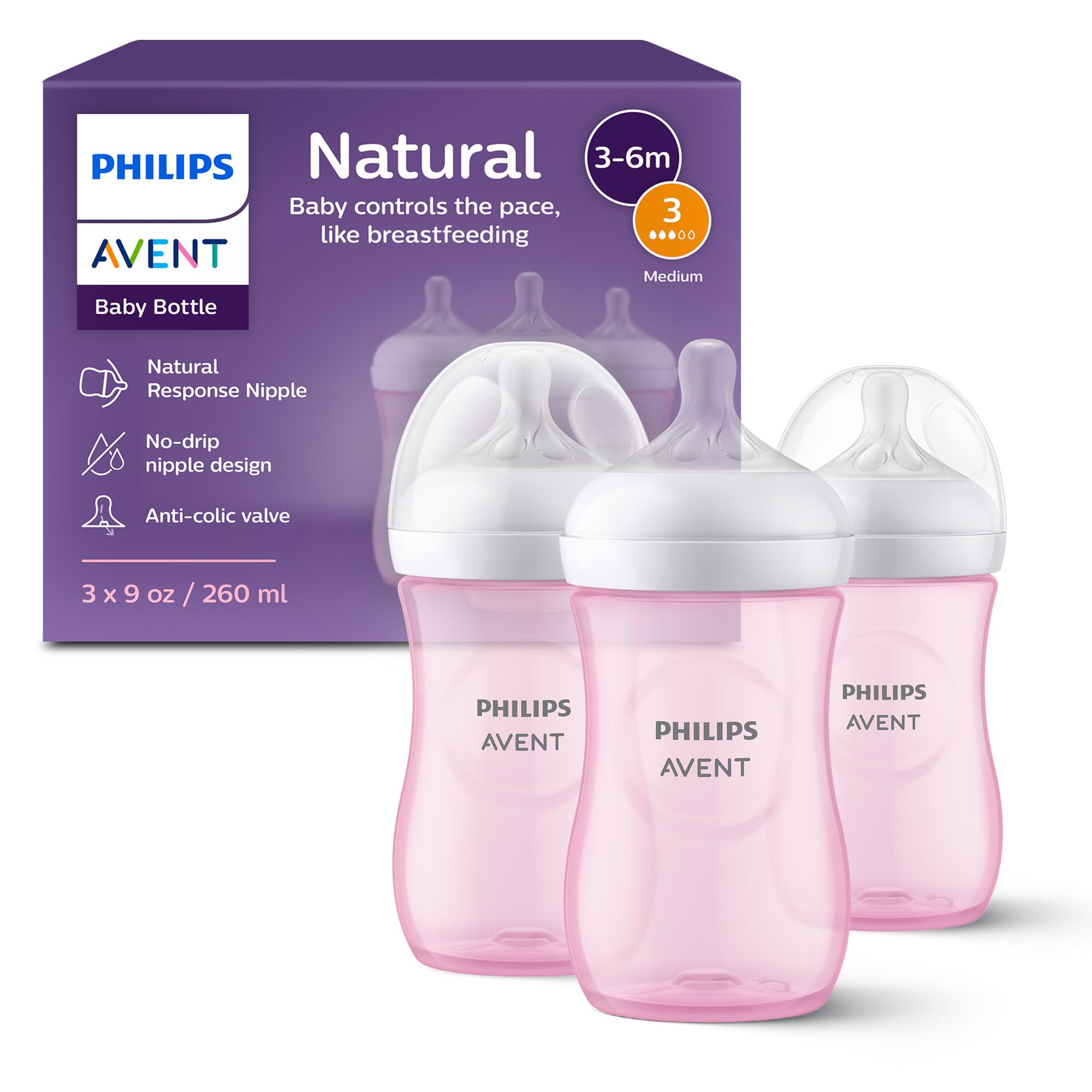 Philips Avent Natural Baby Bottles with Natural Response Nipples (Medium Flow, Flow 3), 9oz, Pink, 3-pack, SCY903/13