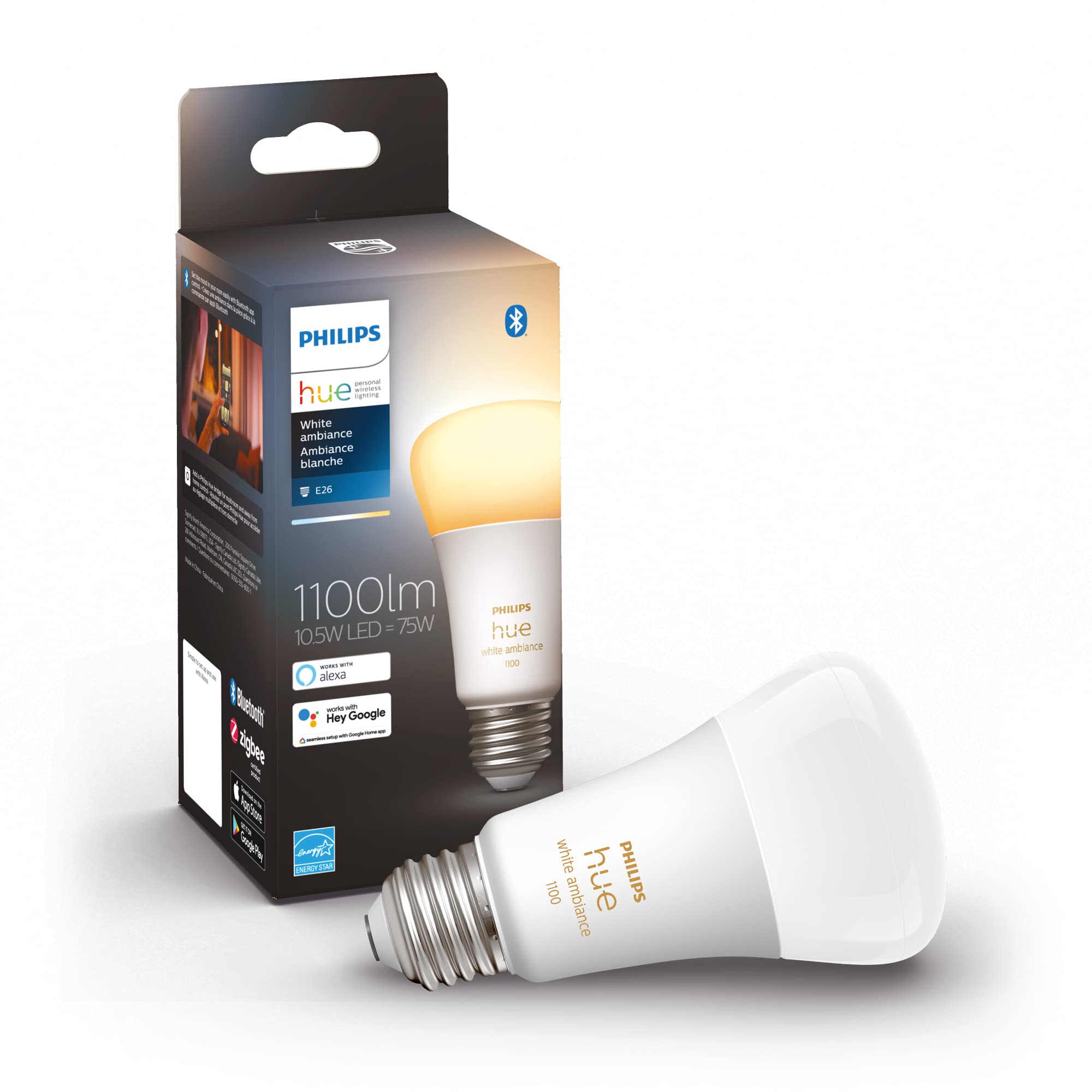 Philips Hue White Ambiance 10.5W Equivalent 75W A19 Base E26 LED Smart Bulb, Warm-to-Cool White Light, Bluetooth & Zigbee Compatible, Voice Activated with Alexa & Google Assistant