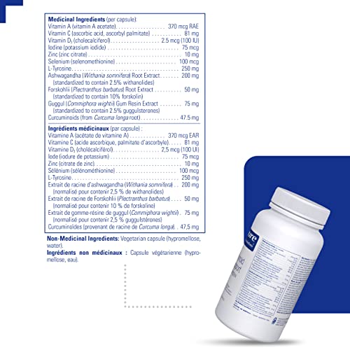 This comprehensive thyroid support formula contains vitamins, minerals and herbal extracts to nourish and support thyroid gland function. Healthy vitamin A, vitamin D, zinc and selenium status have been associated with maintaining healthy thyroid cell metabolism as well as triiodothyronine (T3) and thyroxine (T4) hormone function. Kelp contains nutrients and minerals that support the thyroid, particularly iodine. Iodine and l–tyrosine are key components in the synthesis of thyroid hormones. Coleus extract contains forskolin, which has been shown to support adenylate cyclase activity, supporting thyroid hormone metabolism. It may also support healthy lean body composition. Research indicates that ashwagandha and guggul are also key factors for helping to sustain healthy thyroid function.