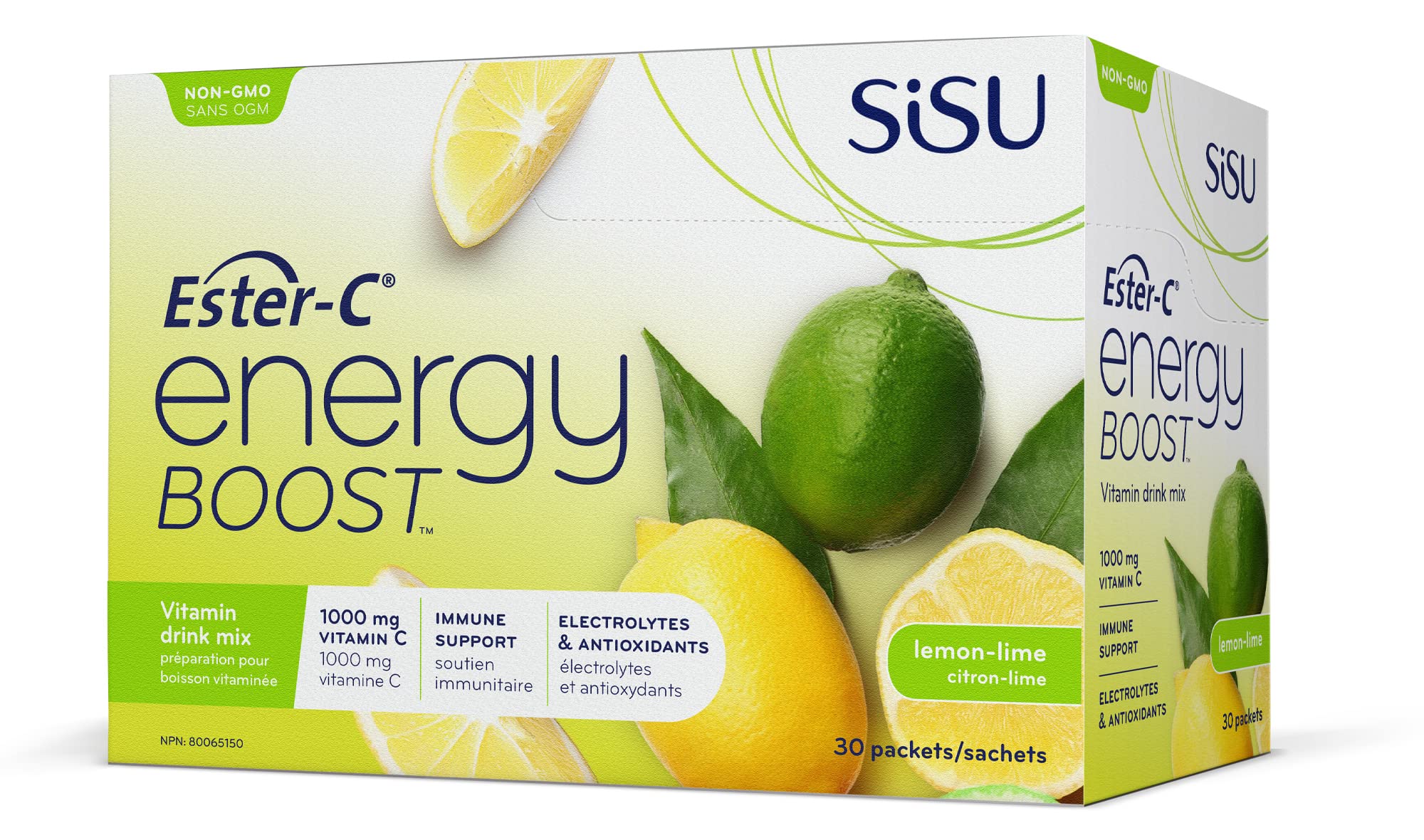 Sisu Energy Boost with Ester-C, Lemon-Lime, 24-hour Immune Support, Vitamin C Drink Mix with Energizing B Vitamins & Electrolytes, 30 Individual Packets, Vegan, Non-GMO, Gluten, Dairy Free