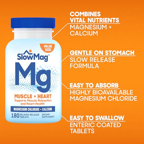 SlowMag Mg Muscle + Heart dietary supplement is specially formulated to provide magnesium to help support proper muscle function and cardiovascular health; magnesium also helps your body properly absorb calcium. Formulated with magnesium chloride for better absorption than magnesium oxide, and with added calcium to support normal nerve and muscle function. The slow-release tablets feature an enteric coating to help reduce the chance of stomach upset.