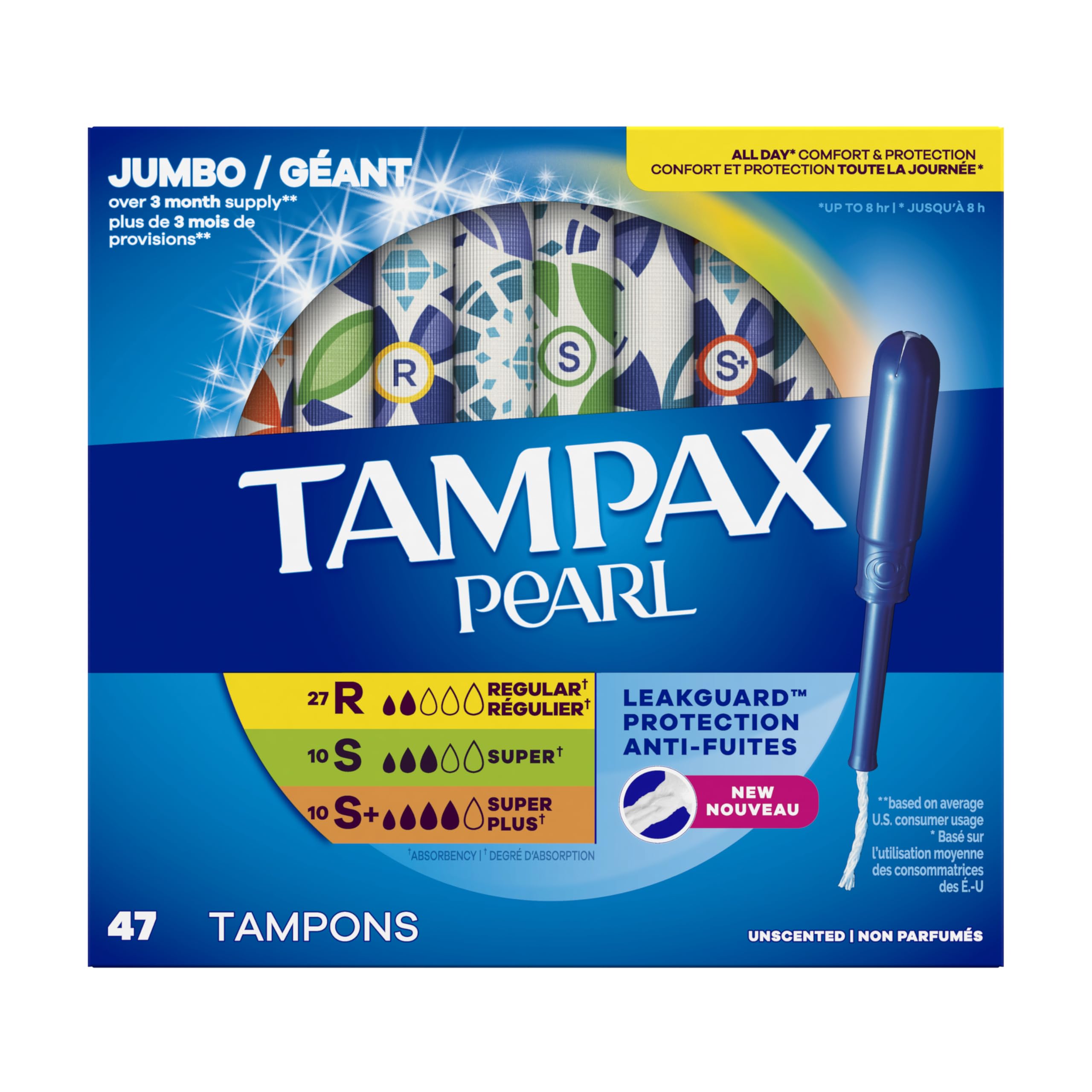 Tampax Pearl Tampons Multipack, with LeakGuard Braid, Regular/Super/Super Plus Absorbency, Up to 100% Leak and Odor Free Protection, Unscented, 47 Count