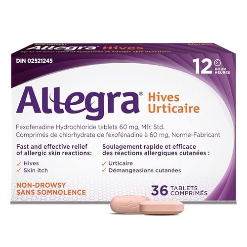 Allegra Hives, 12-Hour Itchy Skin Relief Due to Hives, Allergic Skin Reactions, Non-Drowsy Allergy Medication, 60 mg Fexofenadine Hydrochloride Antihistamine, Adults and Kids, 12 and Older, 36 Tablets